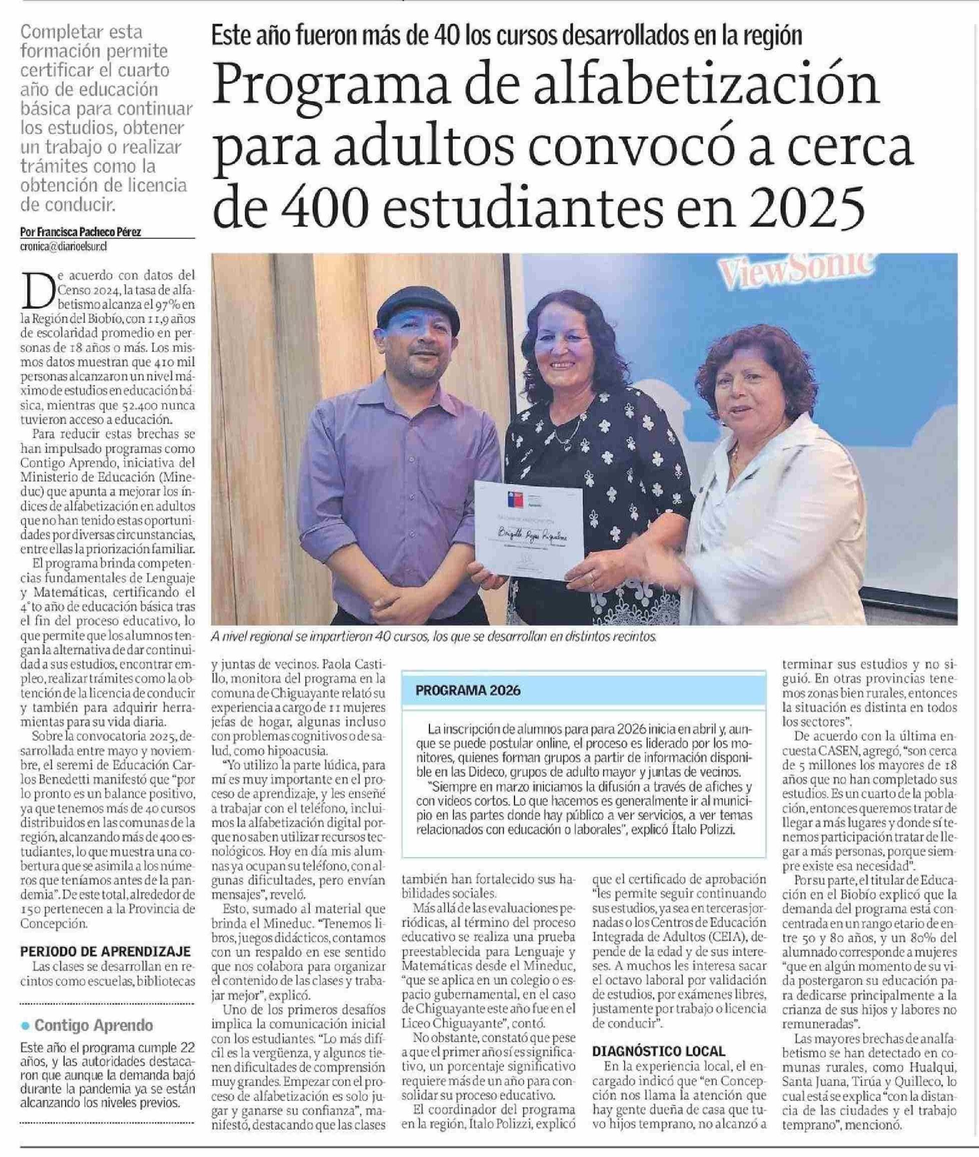 Programa de alfabetización para adultos convocó a cerca de 400 estudiantes en 2025 16-01-2026 El Sur |