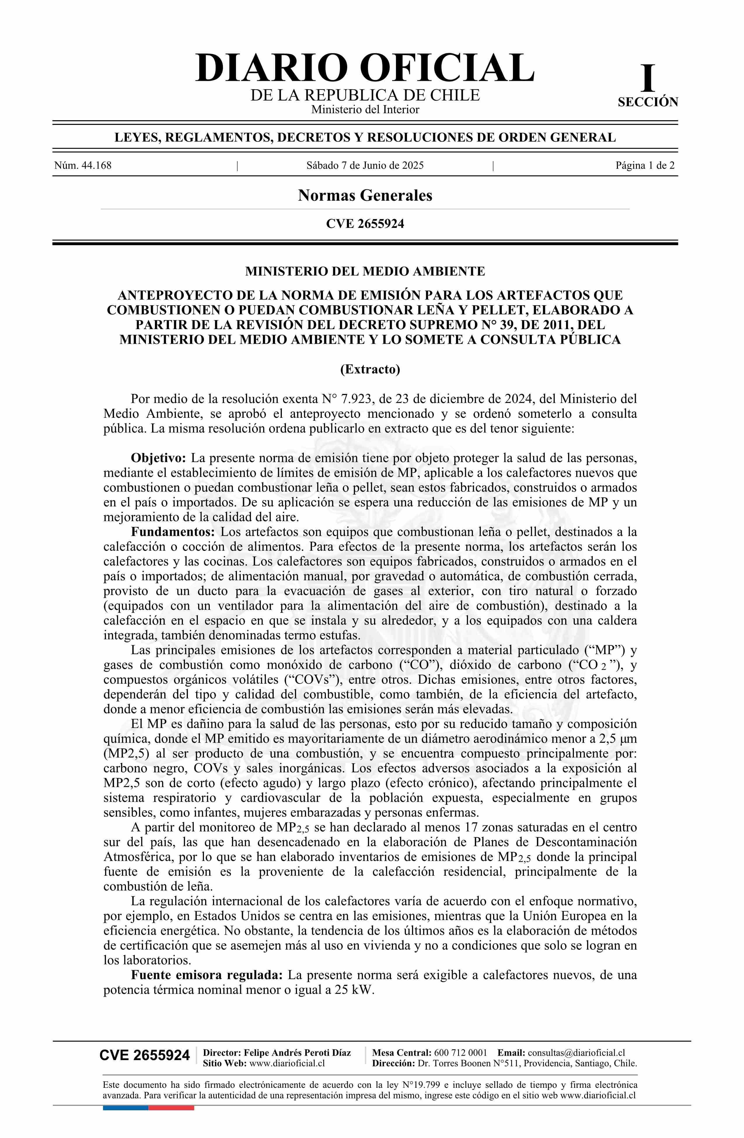 | Título: | Extracto de resolución exenta número 7.923, de 2024.- Aprueba anteproyecto de la norma de emisión para los artefactos que combustionen o puedan combustionar leña y pellet, elaborado a partir de la revisión del decreto N° 39, de 2011, y lo somete a consulta pública |