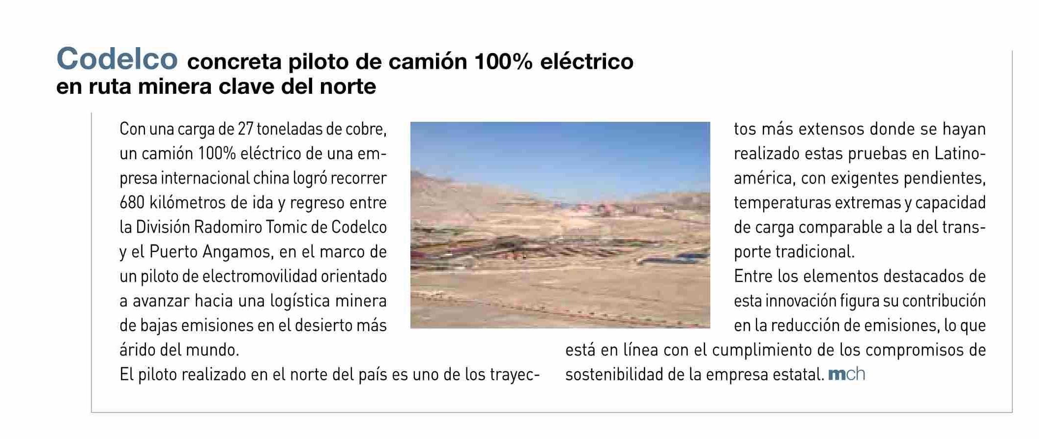 Título: Codelco concreta piloto de camión 100% eléctrico en ruta minera clave del norte