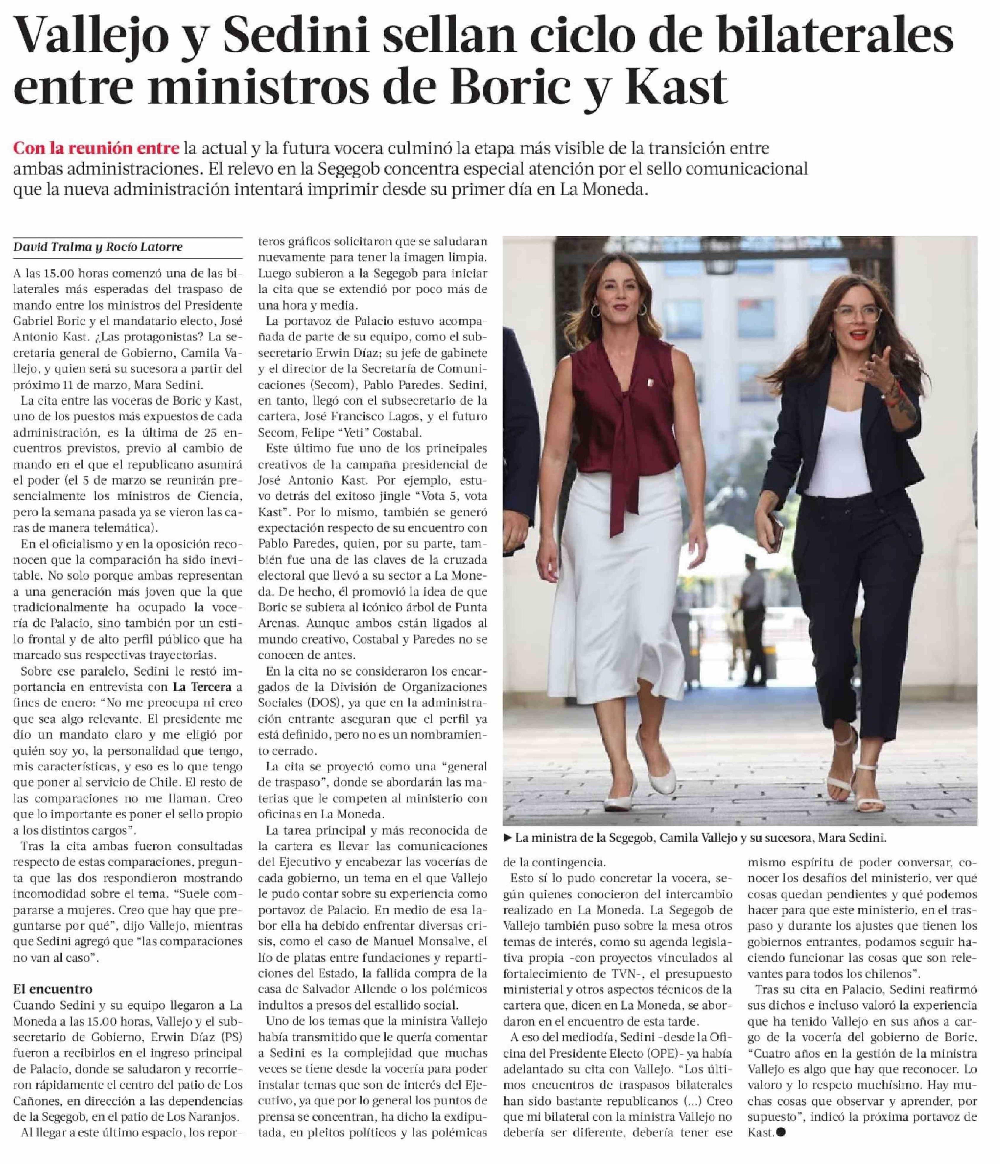 Vallejo y Sedini sellan ciclo de bilaterales entre ministros de Boric y Kast 26-02-2026 La Tercera |