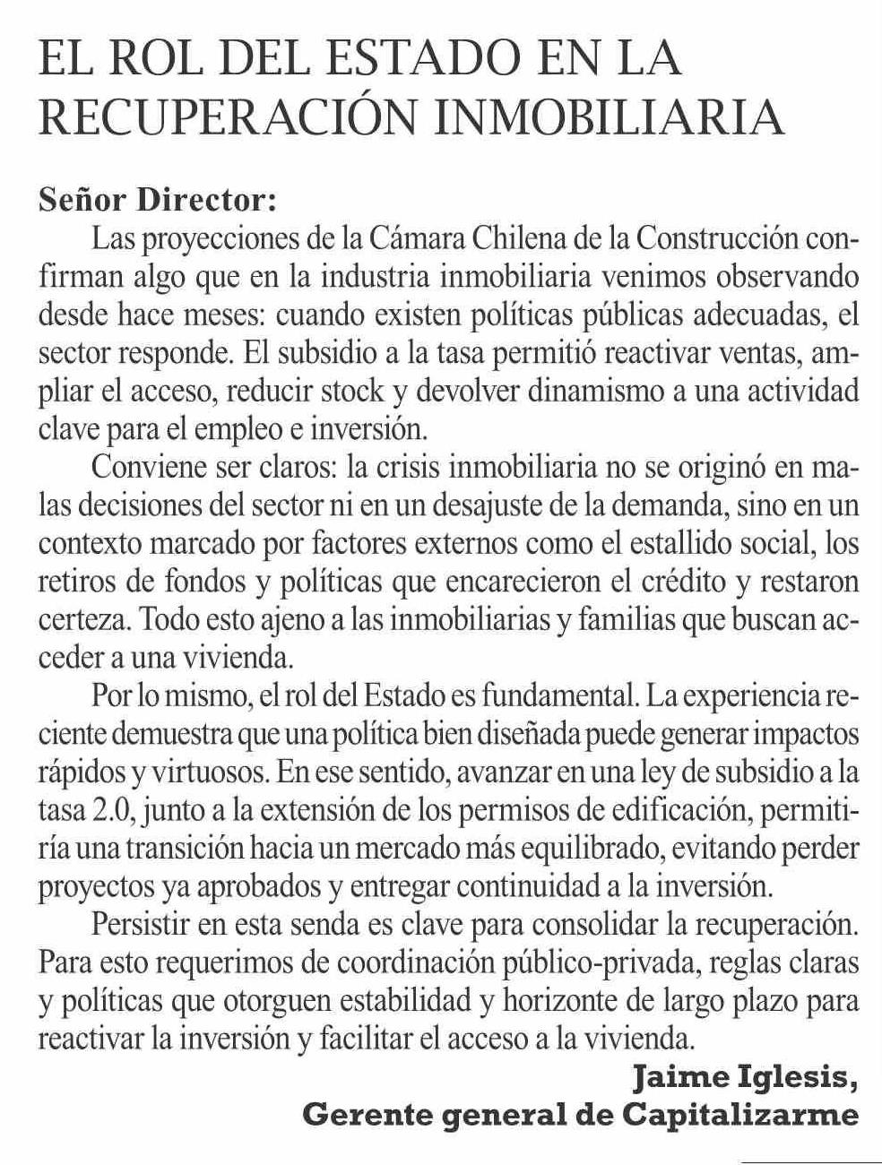| Título: | Cartas: EL ROL DEL ESTADO EN LA RECUPERACIÓN INMOBILIARIA |