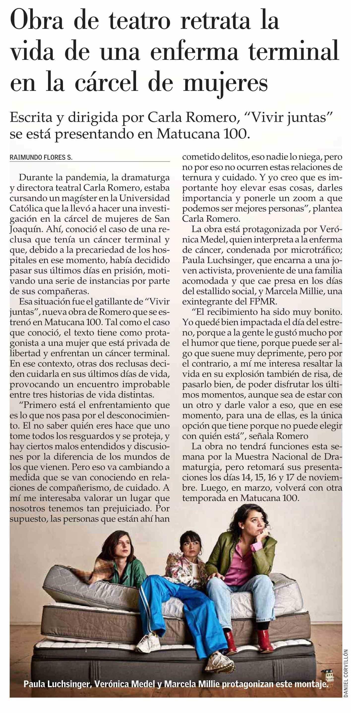 Obra de teatro retrata la vida de una enferma terminal en la cárcel de mujeres 08-11-2024 El Mercurio |