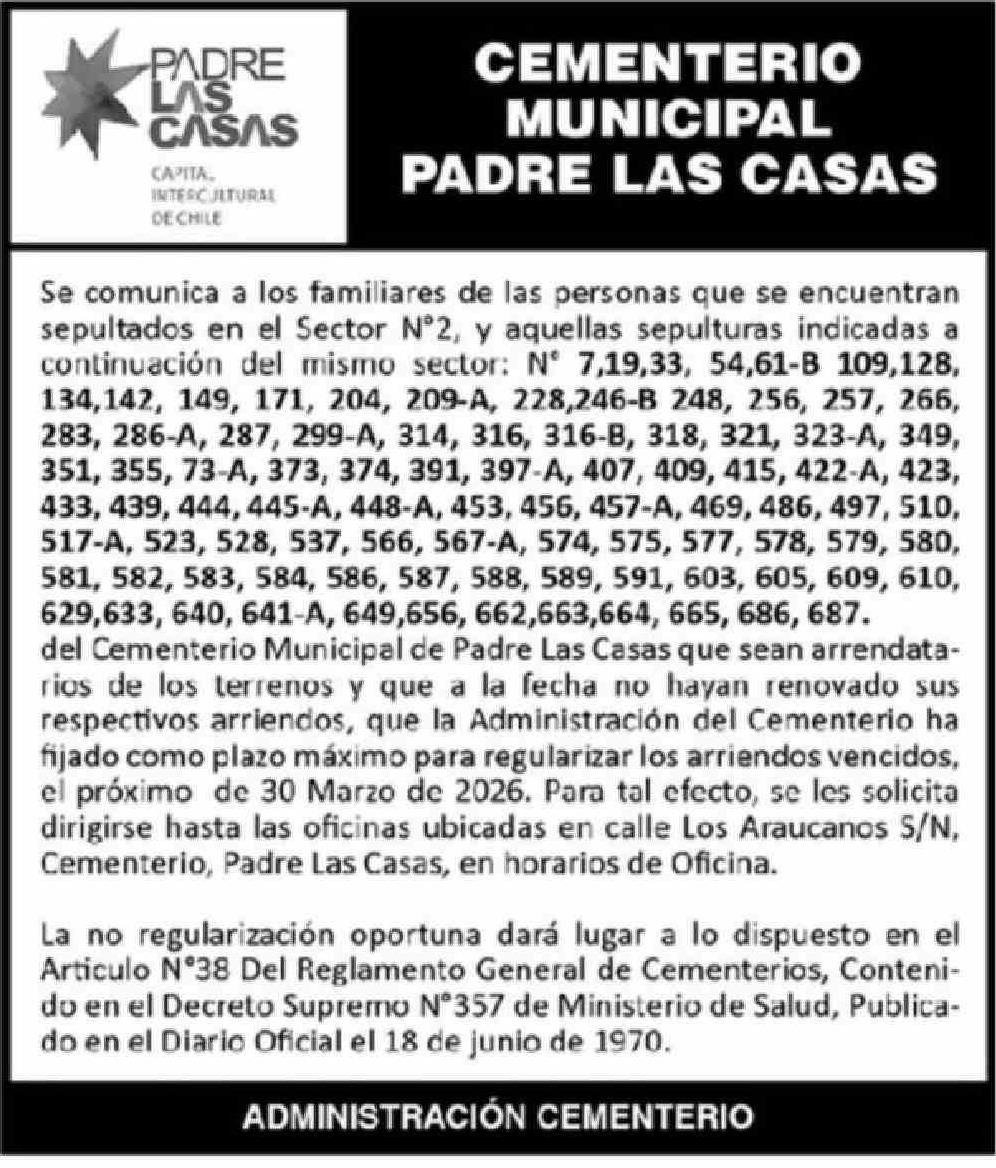 Extractos: CEMENTERIO MUNICIPAL PADRE LAS CASAS 05-03-2026 El Austral de la Araucanía |