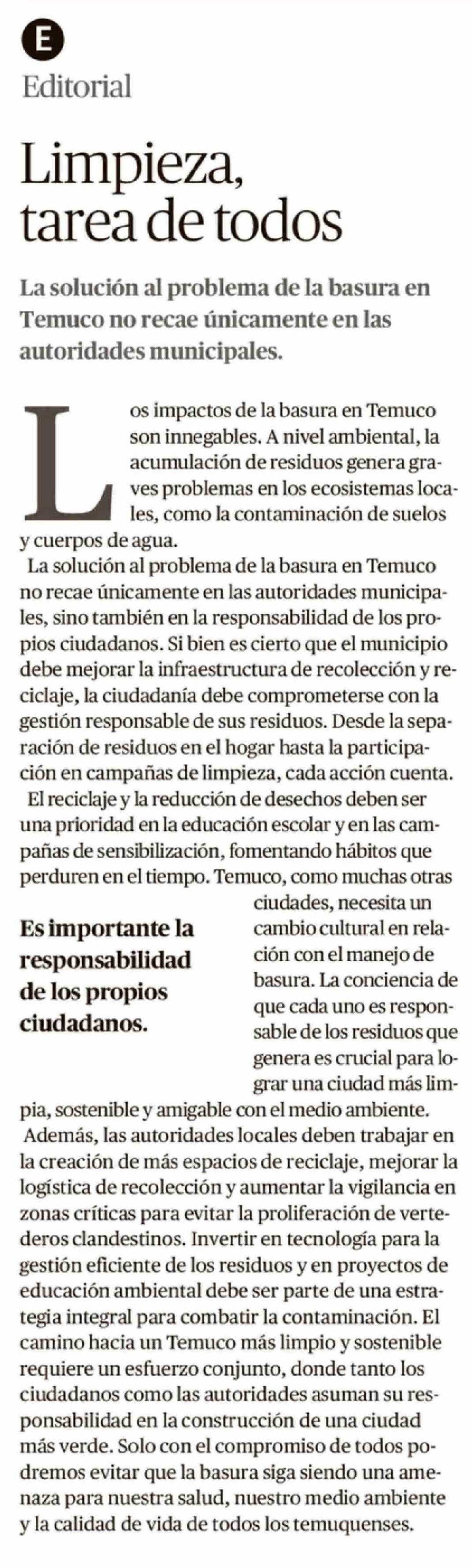 Editorial: Limpieza, tarea de todos 22-03-2026 El Austral de la Araucanía |