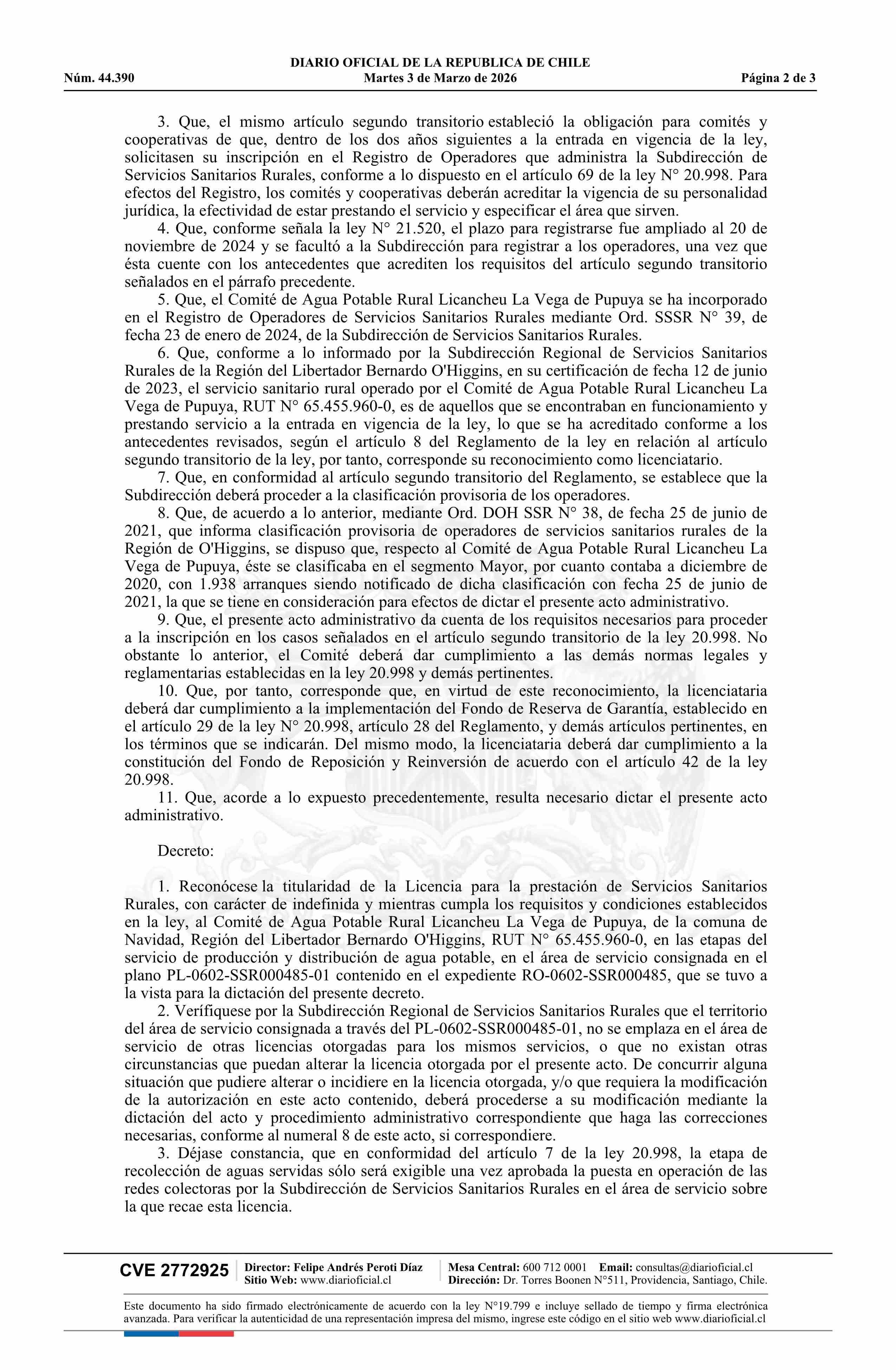Decreto exento número 34, de 2026.- Reconoce licencia de servicio sanitario rural al Comité de Agua Potable Rural Licancheu La Vega de Pupuya, comuna de Navidad, provincia de Cardenal Caro, Región del Libertador Bernardo O'Higgins, y da cuenta de su registro como operador