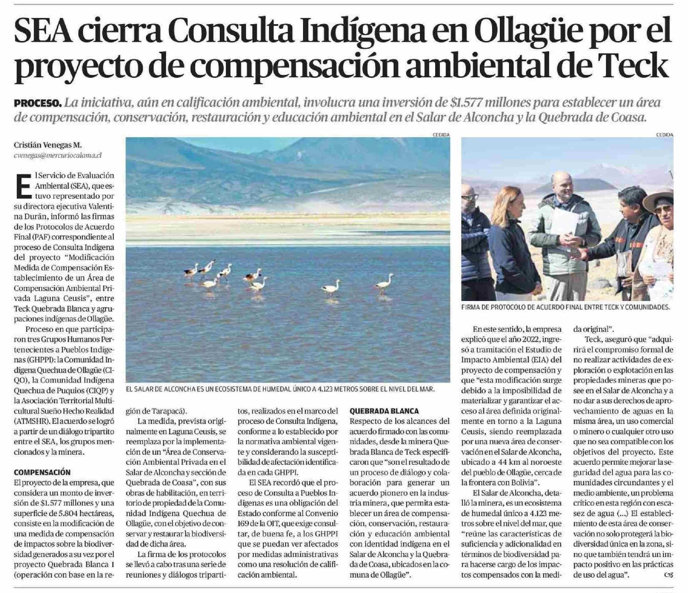 SEA cierra Consulta Indígena en Ollagüe por el proyecto de compensación ambiental de Teck 13-06-2025 El Mercurio de Calama |