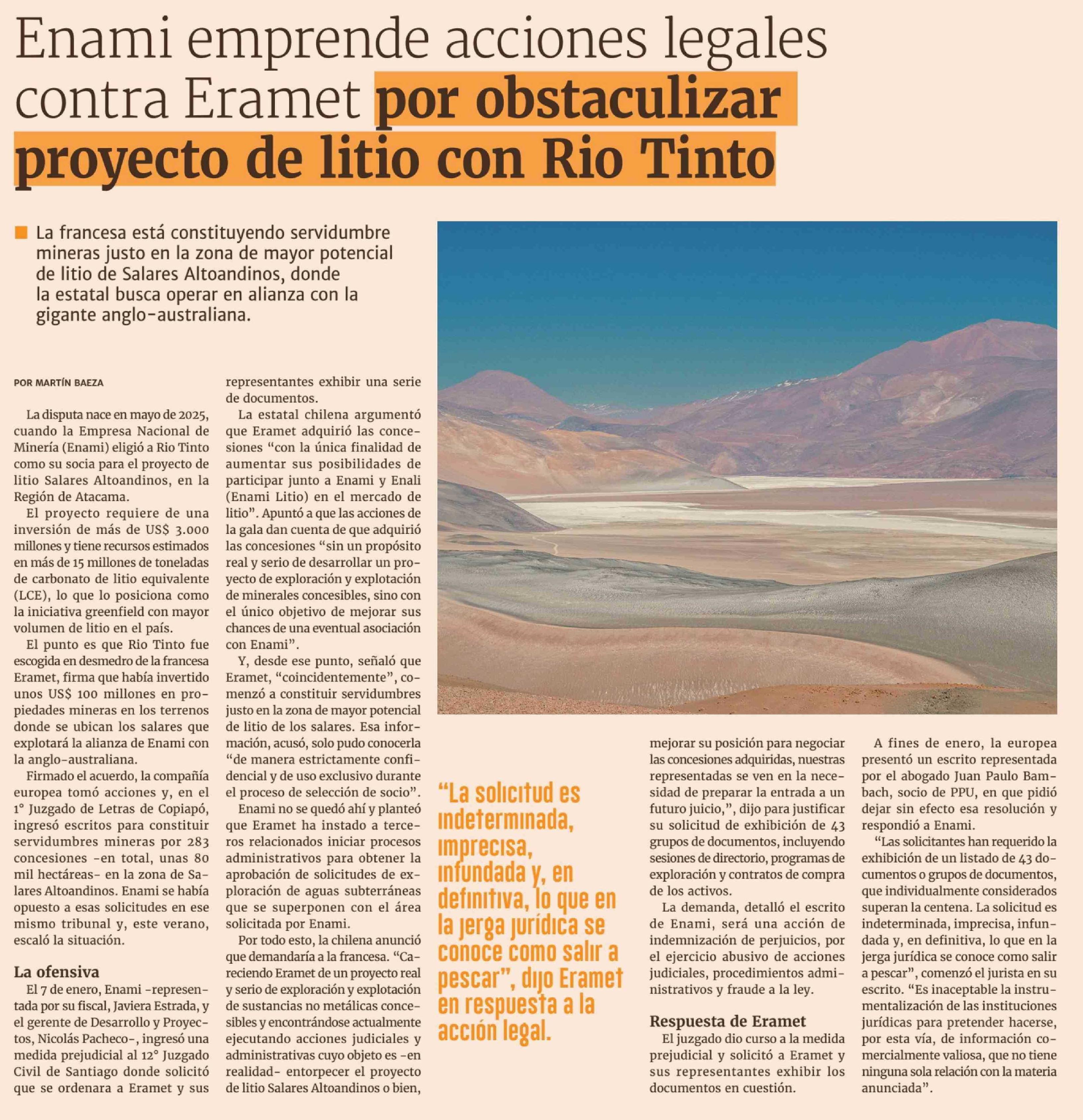 Enami emprende acciones legales contra Eramet por obstaculizar proyecto de litio con Rio Tinto 06-03-2026 Diario Financiero |