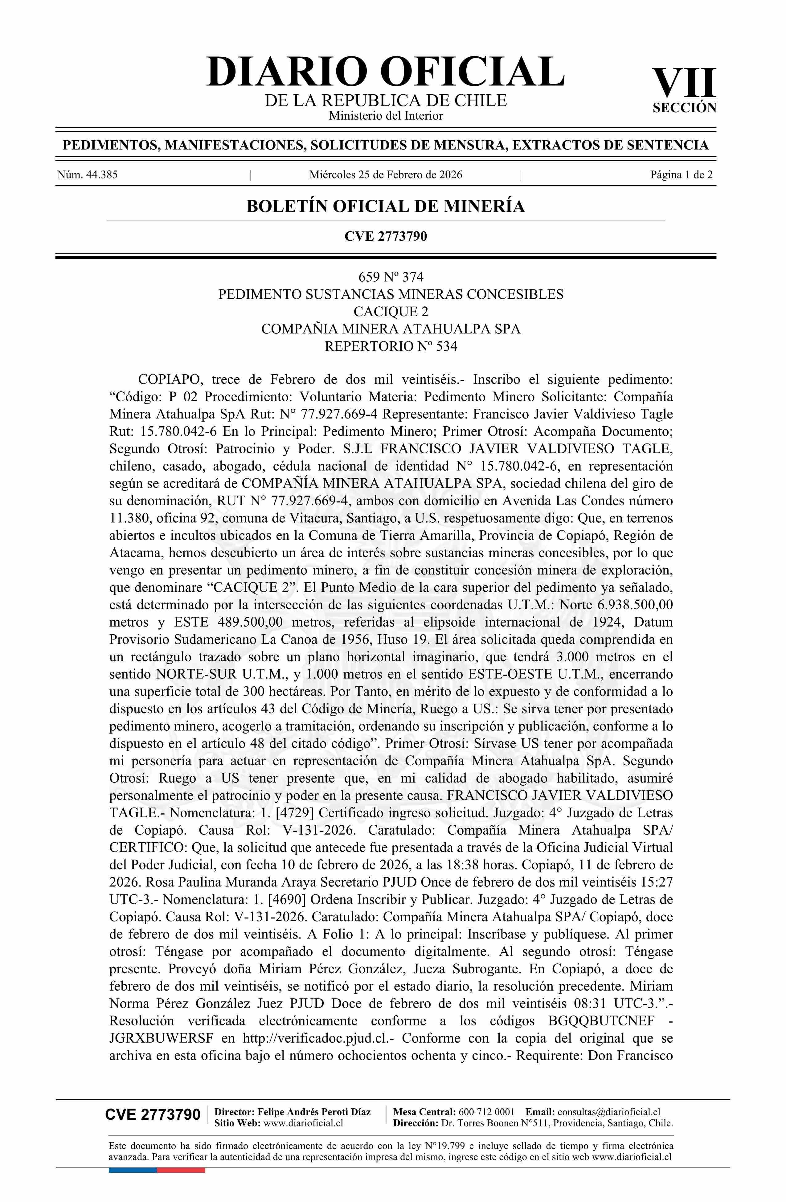 CACIQUE 2 / Compañía Minera Atahualpa SpA 25-02-2026 DIARIO OFICIAL CHILE - BOLETÍN OFICIAL DE MINERÍA |