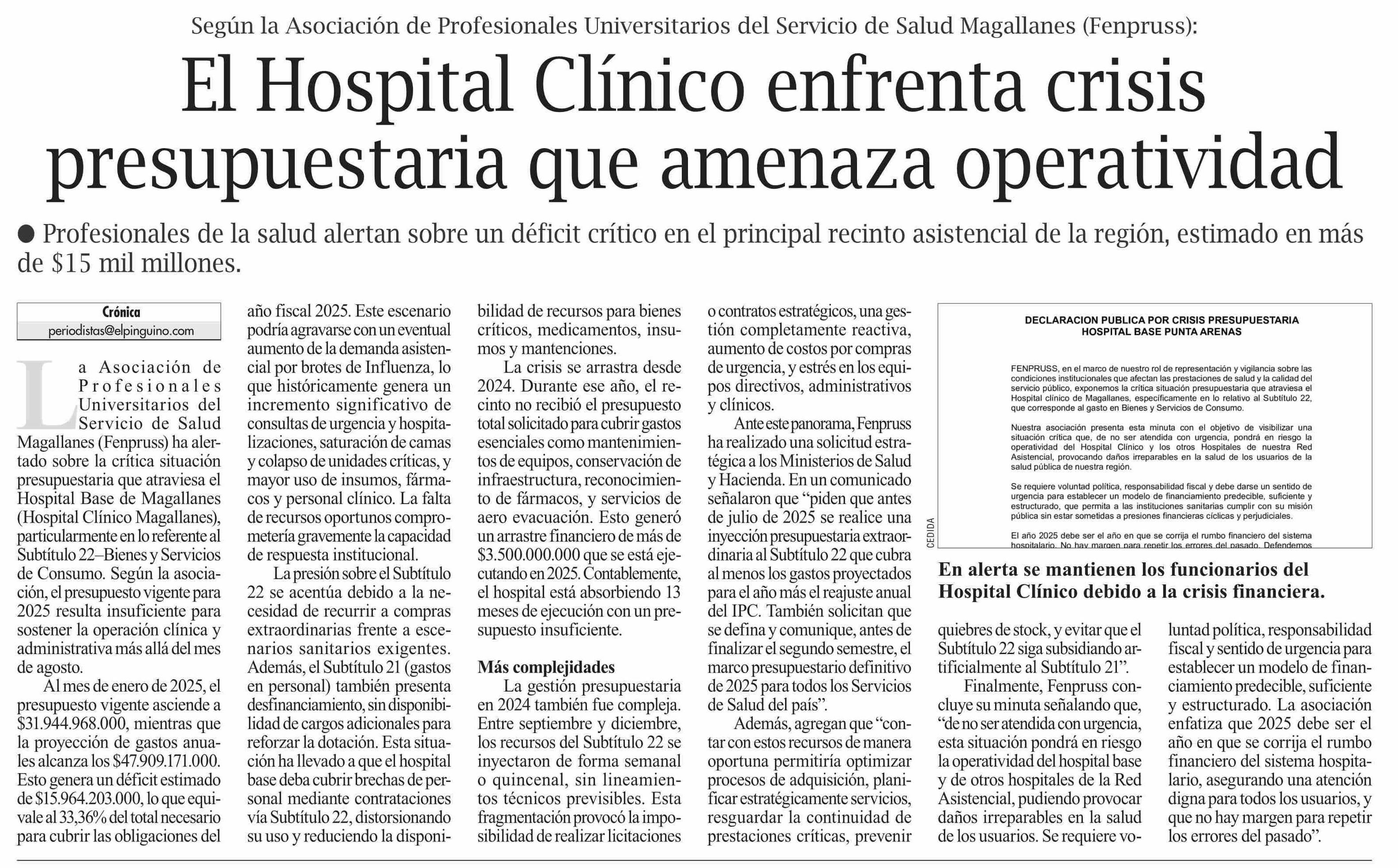 El Hospital Clínico enfrenta crisis presupuestaria que amenaza operatividad 31-05-2025 El Pingüino |