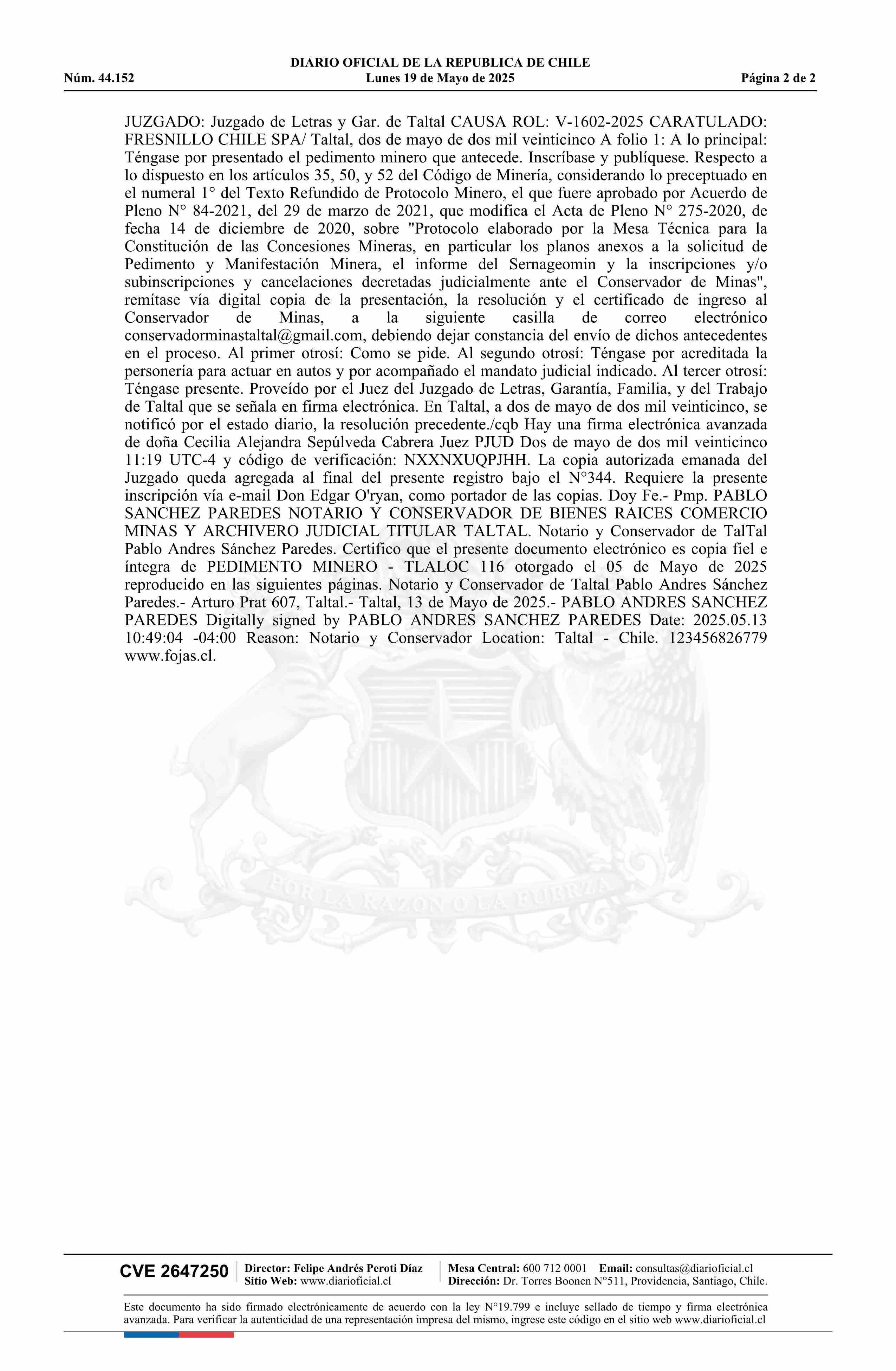 TLALOC 116 / Fresnillo Chile SpA 19-05-2025 DIARIO OFICIAL CHILE - BOLETÍN OFICIAL DE MINERÍA |