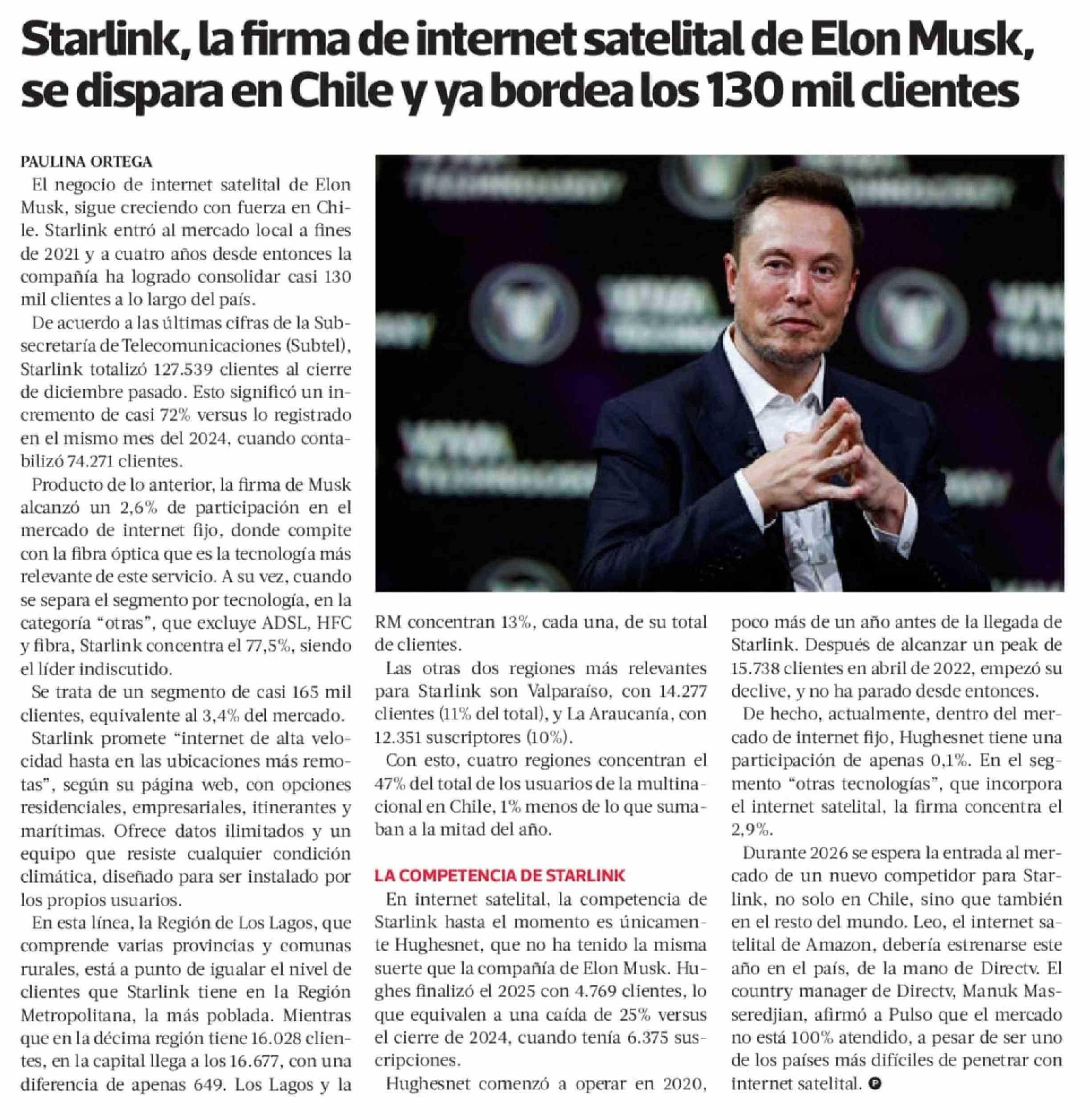 | Título: | Starlink, la firma de internet satelital de Elon Musk, se dispara en Chile y ya bordea los 130 mil clientes |