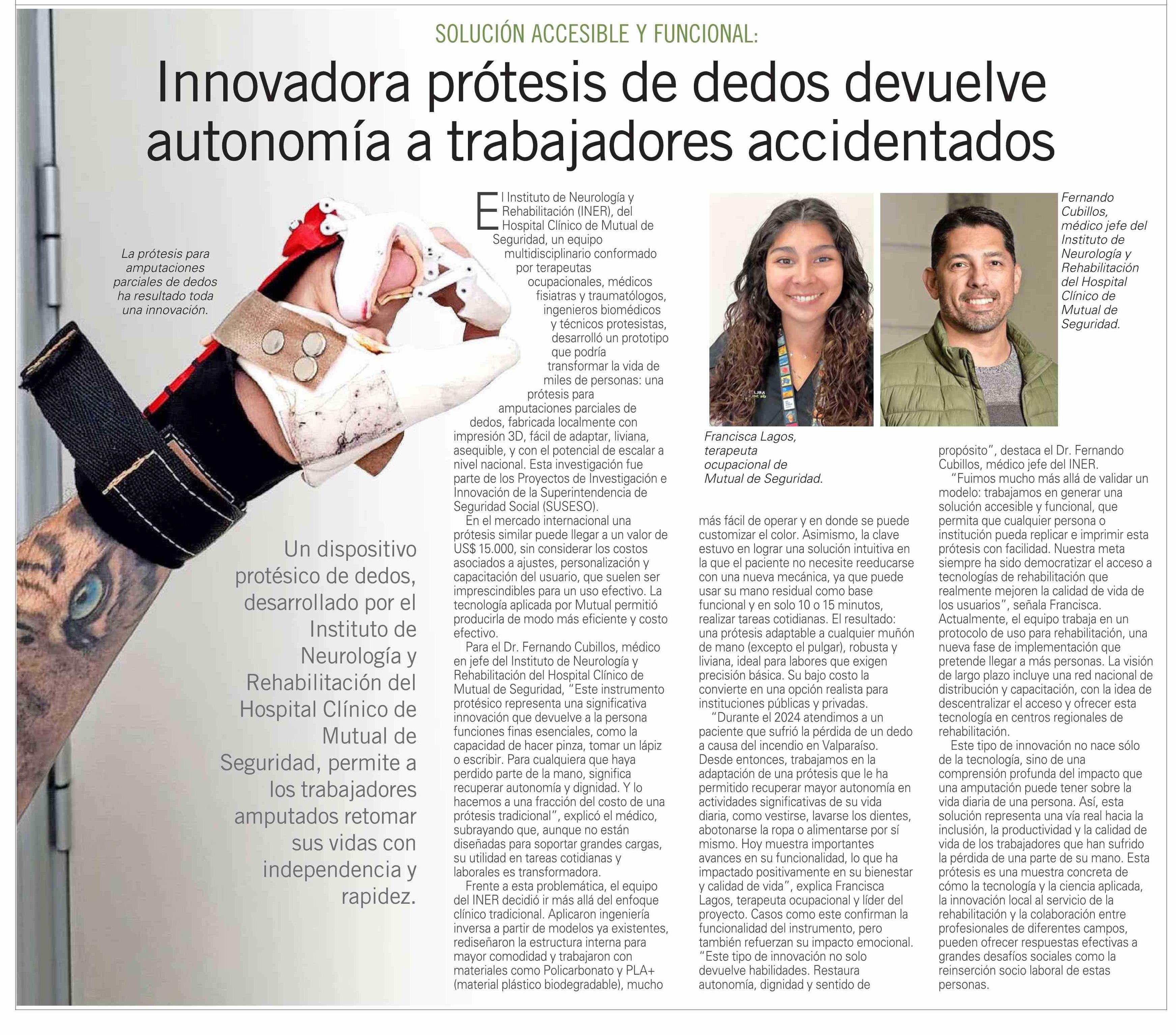 Innovadora prótesis de dedos devuelve autonomía a trabajadores accidentados 22-05-2025 El Mercurio |