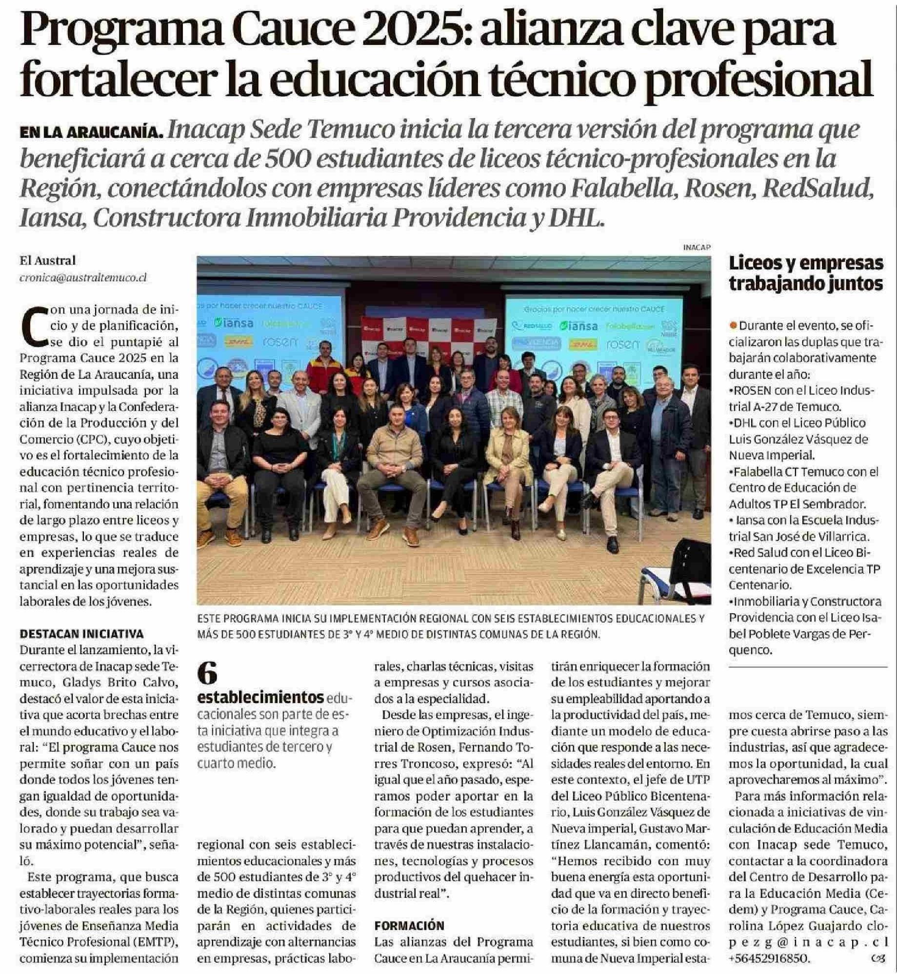 Programa Cauce 2025: alianza clave para fortalecer la educación técnico profesional 28-04-2025 El Austral de la Araucanía |
