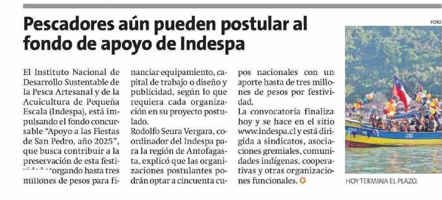 Pescadores aún pueden postular al fondo de apoyo de Indespa 14-05-2025 La Estrella de Antofagasta |