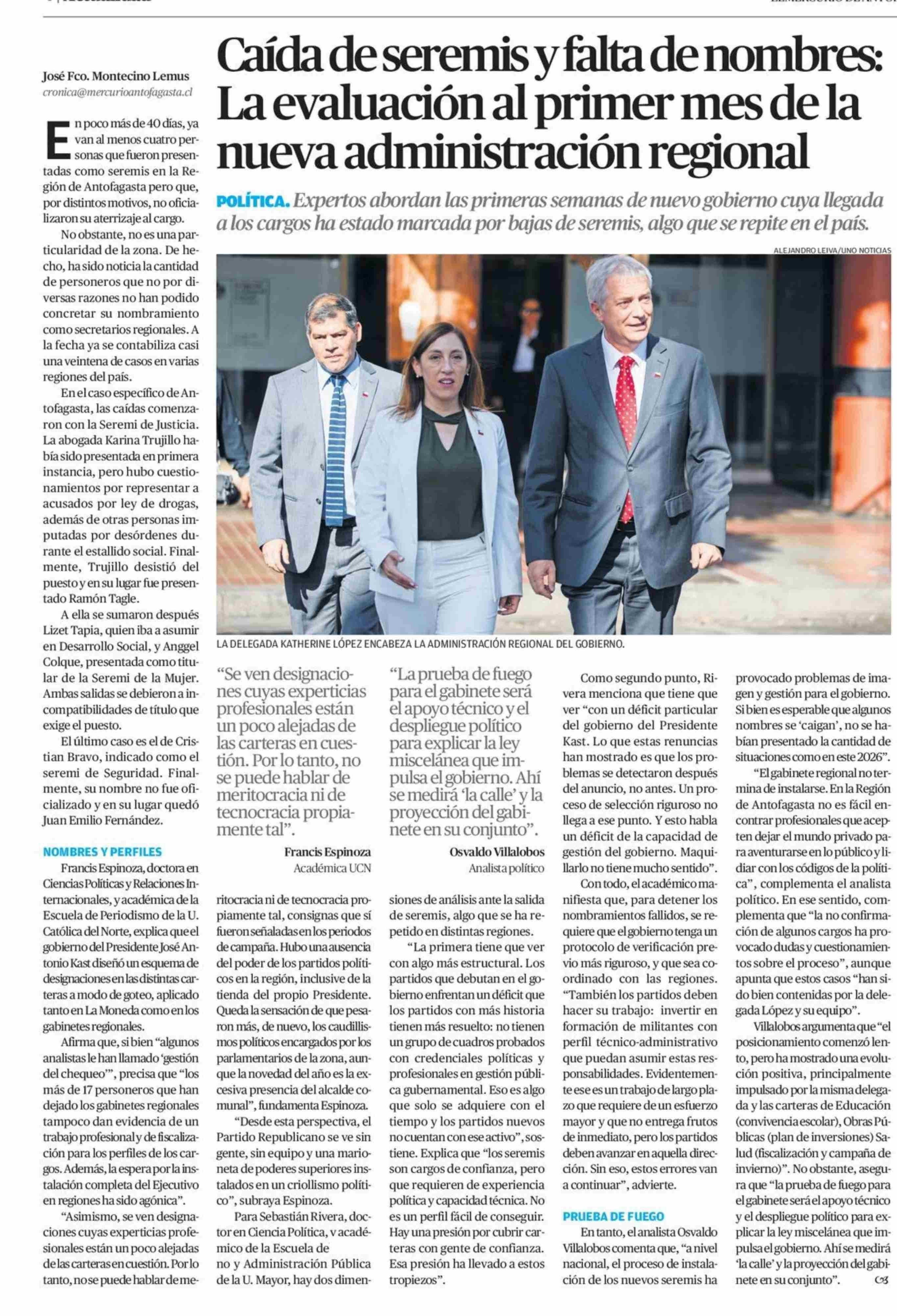 Caída de seremis y falta de nombres: La evaluación al primer mes de la nueva administración regional 27-04-2026 El Mercurio de Antofagasta |