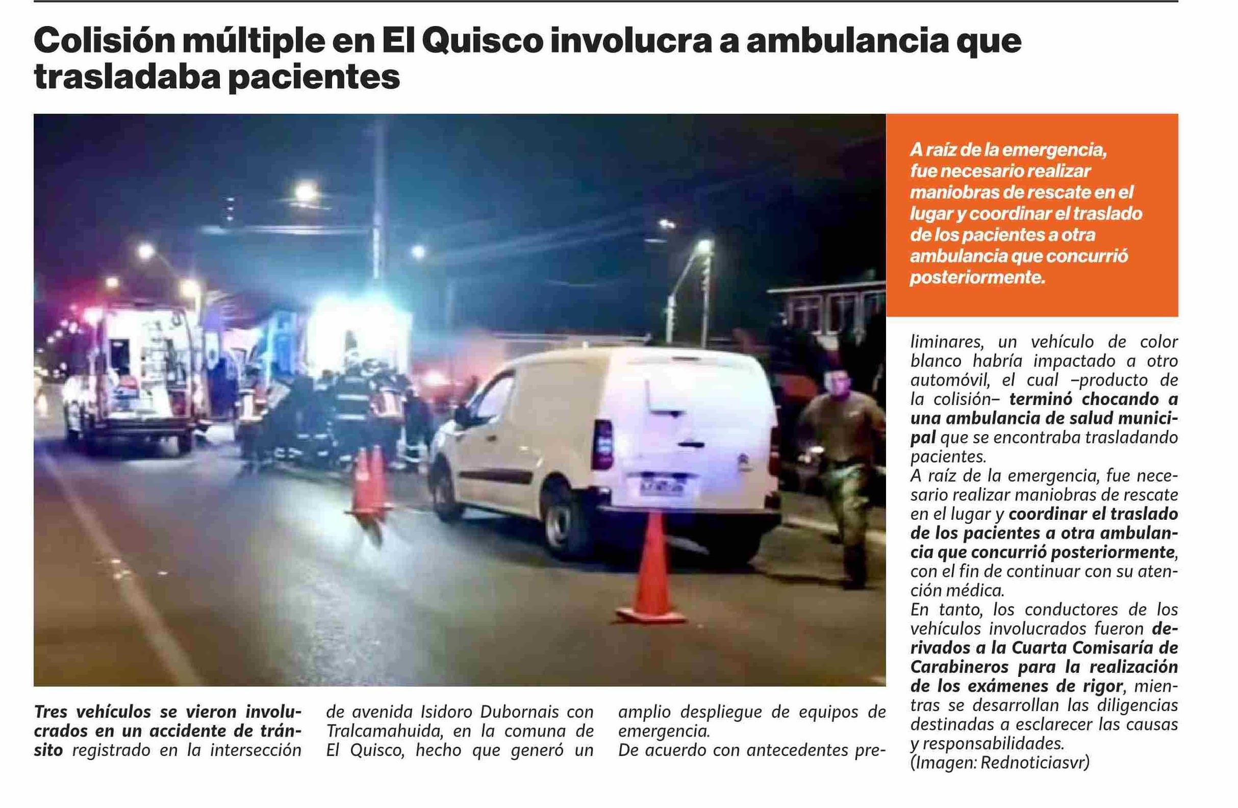 | Título: | Colisión múltiple en El Quisco involucra a ambulancia que trasladaba pacientes |