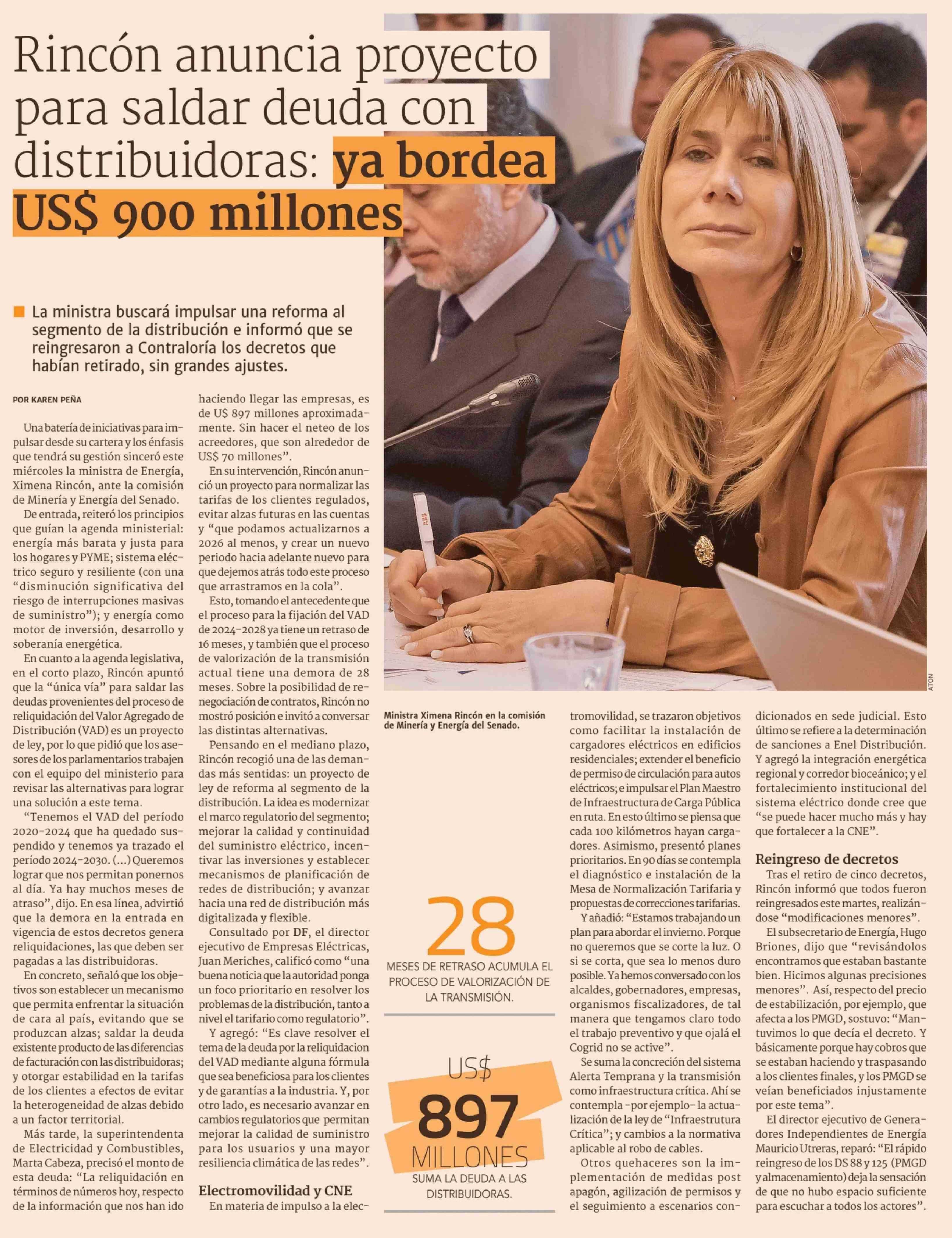 | Título: | Rincón anuncia proyecto para saldar deuda con distribuidoras: ya bordea US$ 900 millones |