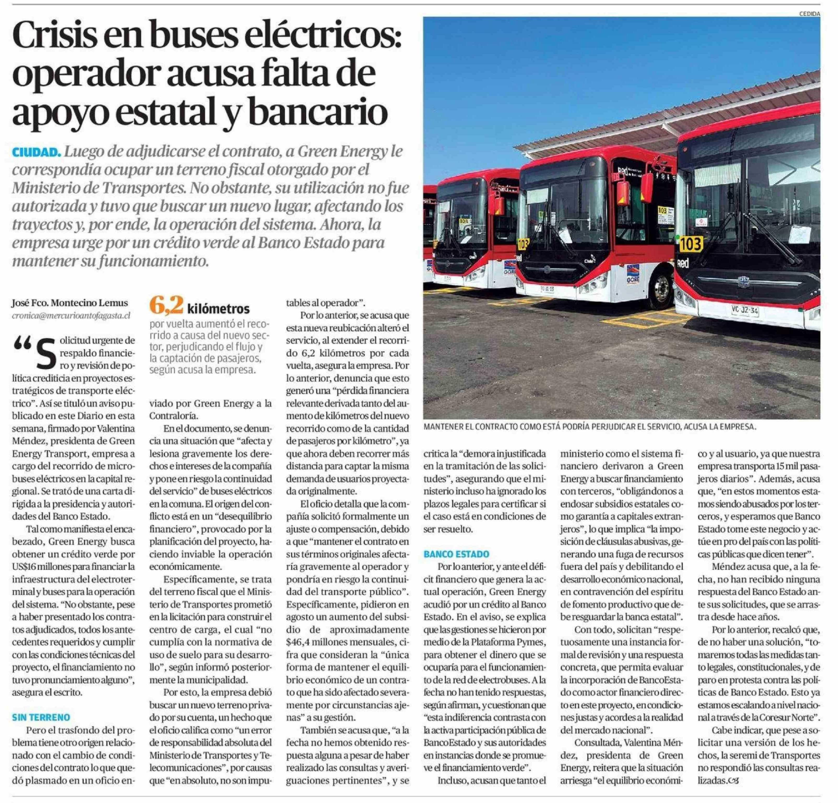 Crisis en buses eléctricos: operador acusa falta de apoyo estatal y bancario 18-04-2026 El Mercurio de Antofagasta |