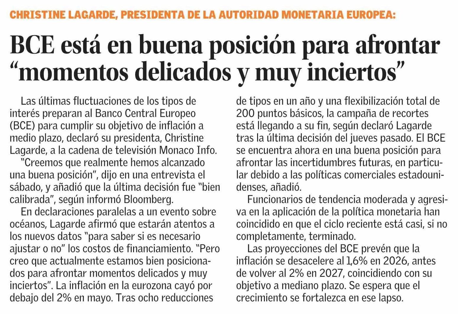 BCE está en buena posición para afrontar “momentos delicados y muy inciertos” 09-06-2025 El Mercurio |
