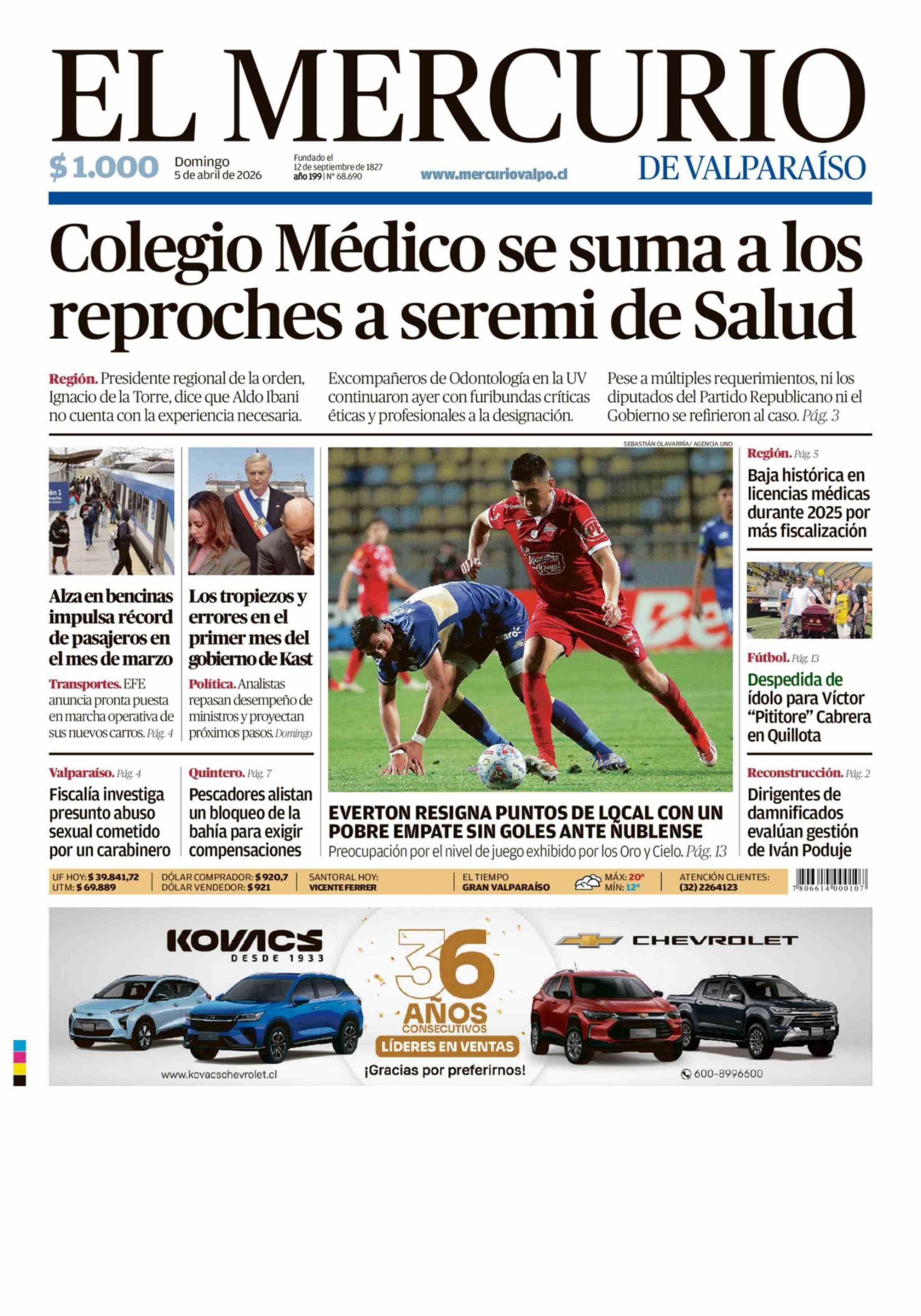 PORTADA EL MERCURIO DE VALPARAÍSO CHILE 05-04-2026 El Mercurio de Valparaíso |
