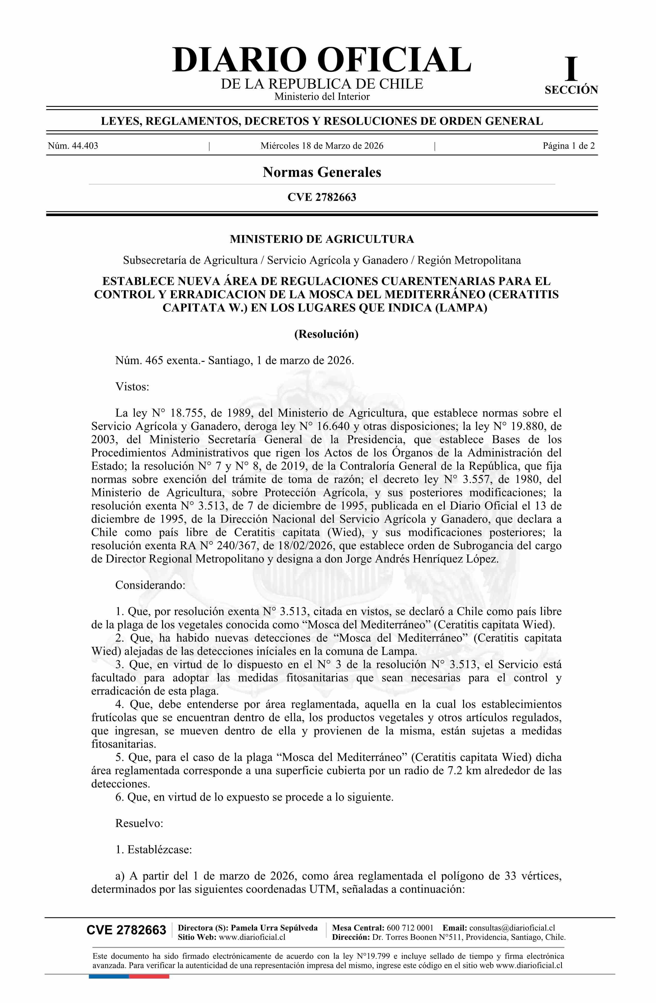 Título: Resolución exenta número 465, de 2026.- Establece nueva área de regulaciones cuarentenarias para el control y erradicación de la Mosca del Mediterráneo (Ceratitis capitata W.) en los lugares que indica