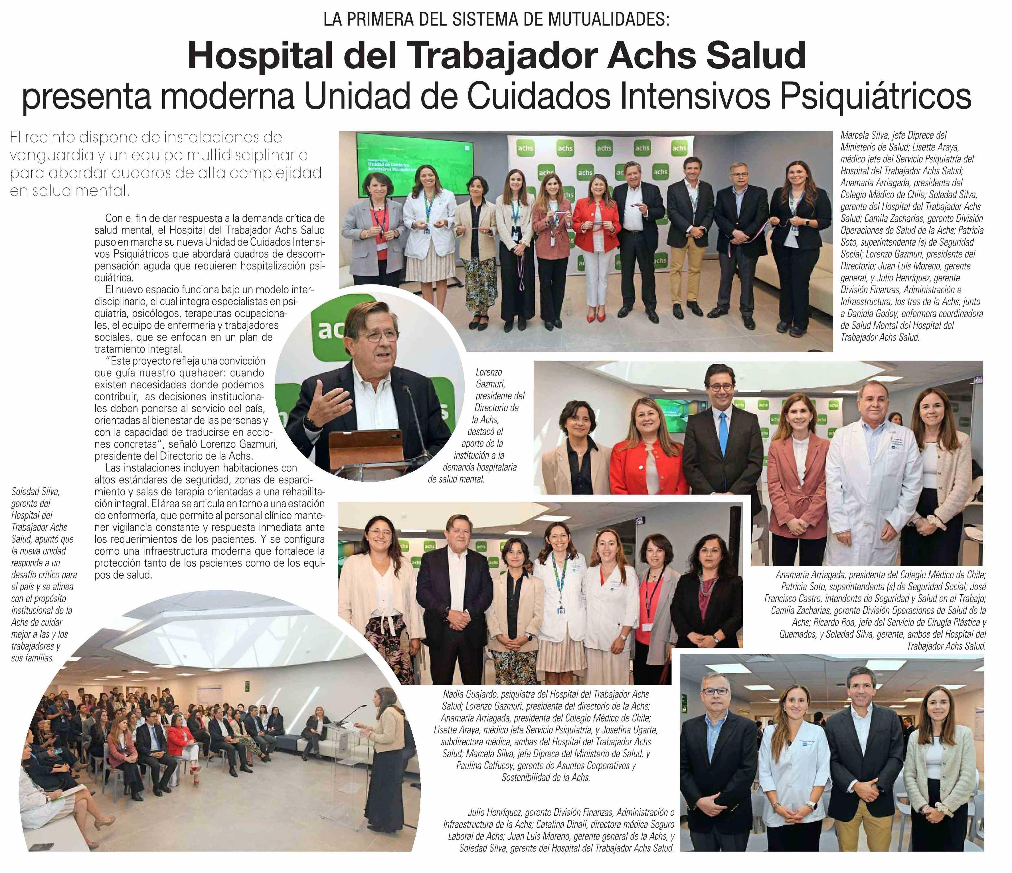 Hospital del Trabajador Achs Salud presenta moderna Unidad de Cuidados Intensivos Psiquiátricos 07-04-2026 El Mercurio |
