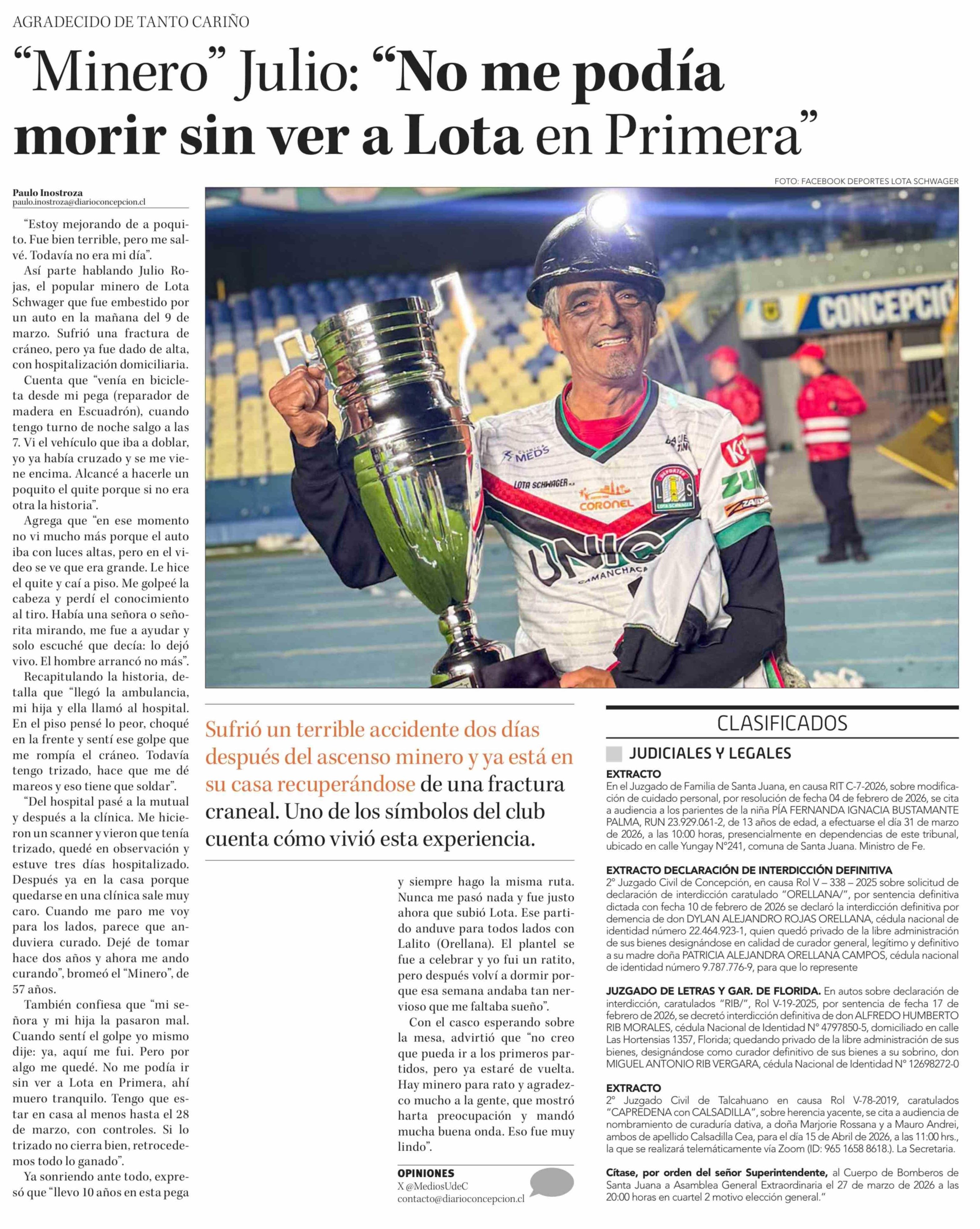 "Minero" Julio: "No me podía morir sin ver a Lota en Primera" 20-03-2026 Diario Concepción |