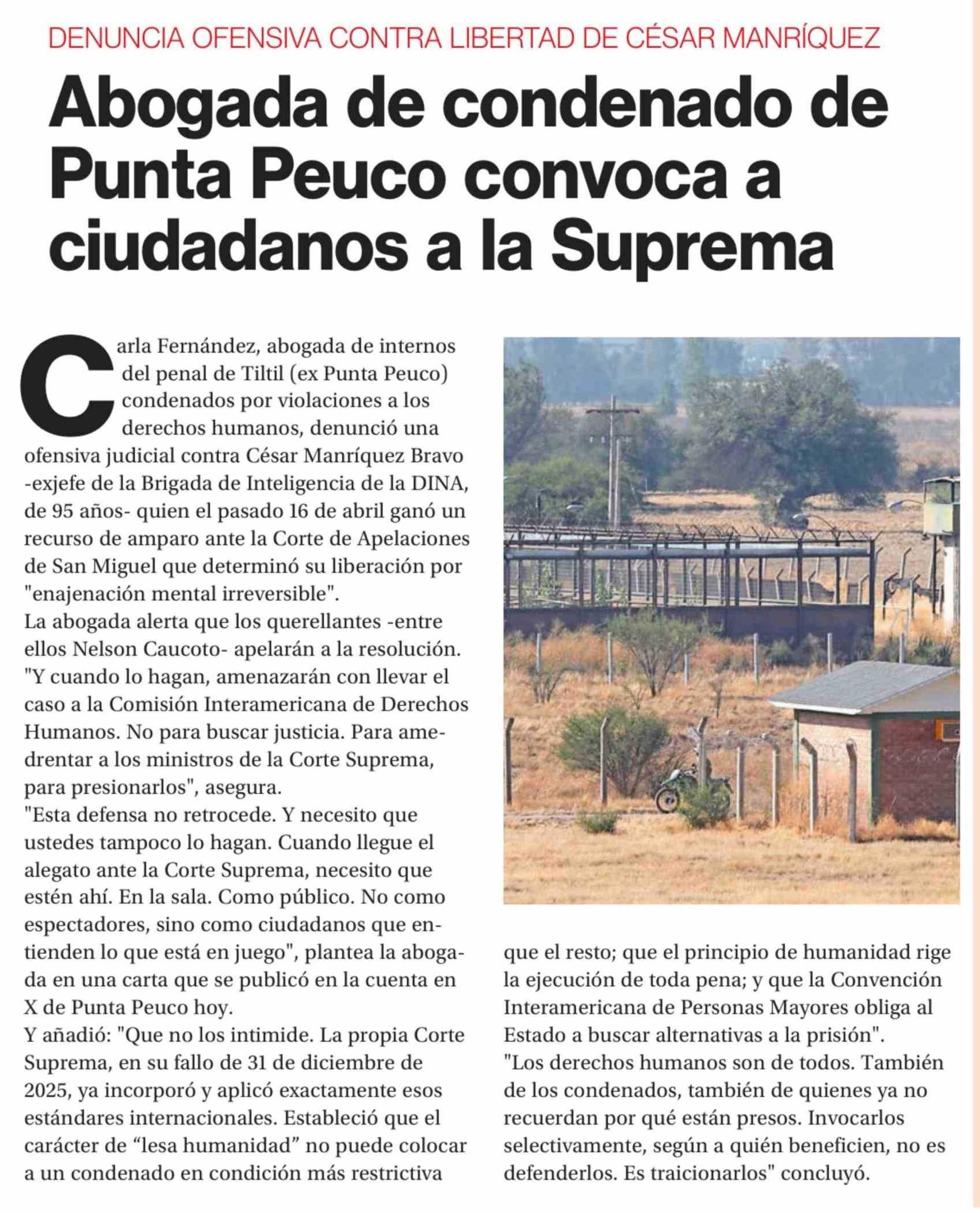 Abogada de condenado de Punta Peuco convoca a ciudadanos a la Suprema 20-04-2026 La Segunda |