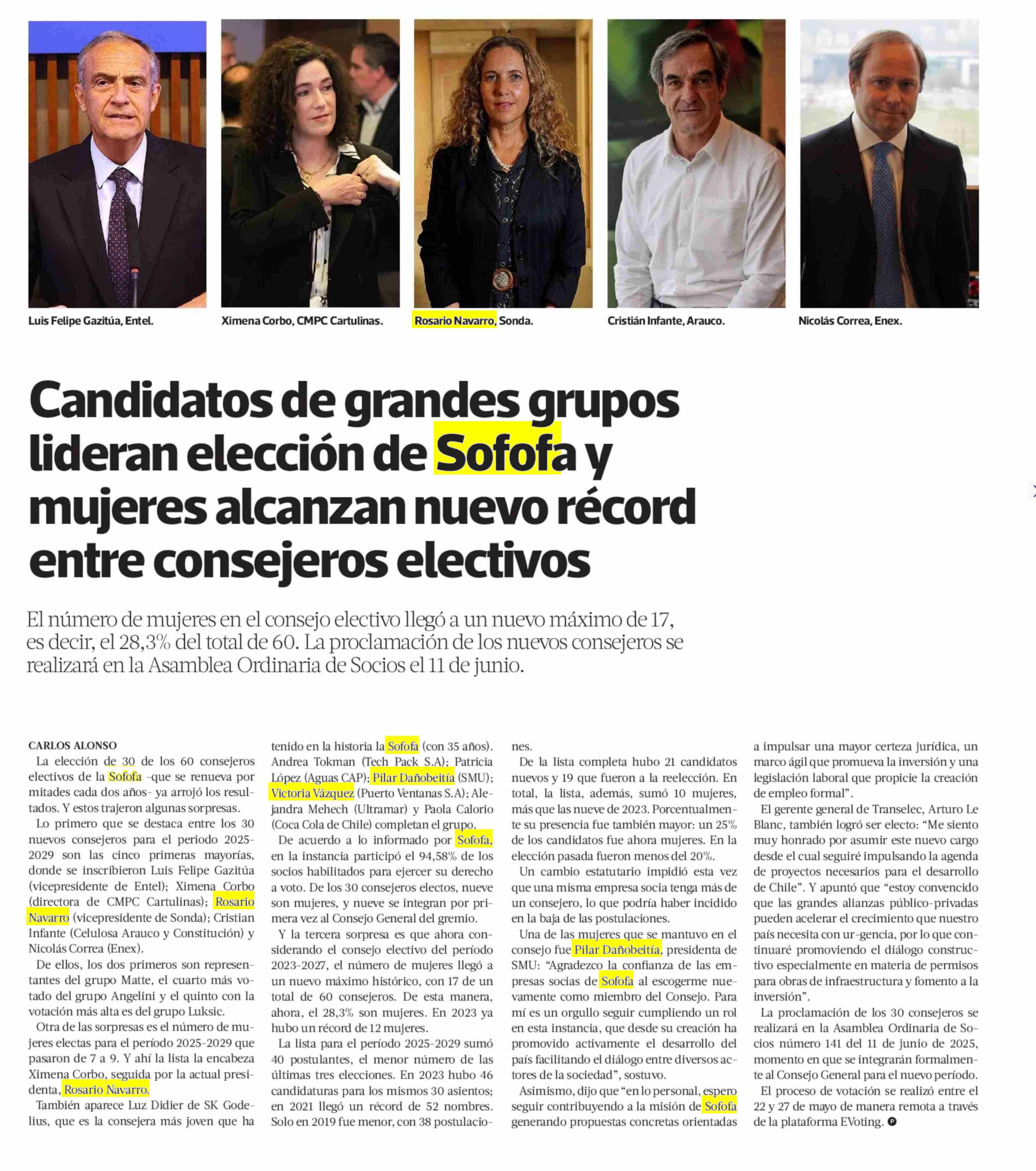 Candidatos de grandes grupos lideran elección de Sofofa y mujeres alcanzan nuevo récord entre consejeros electivos 28-05-2025 La Tercera |
