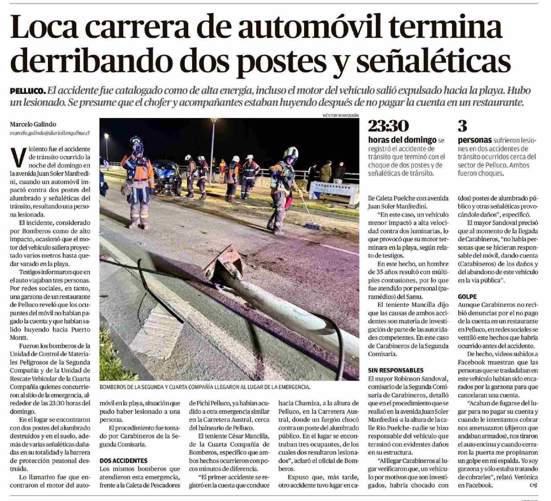 Título: Loca carrera de automóvil termina derribando dos postes y señaléticas