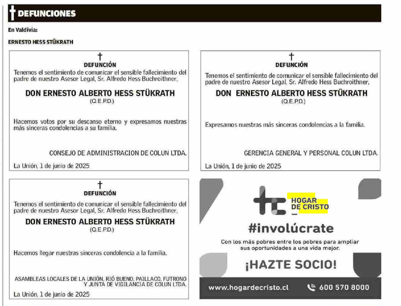 OBITUARIO: 01-06-2025 Diario Austral Región de Los Ríos |