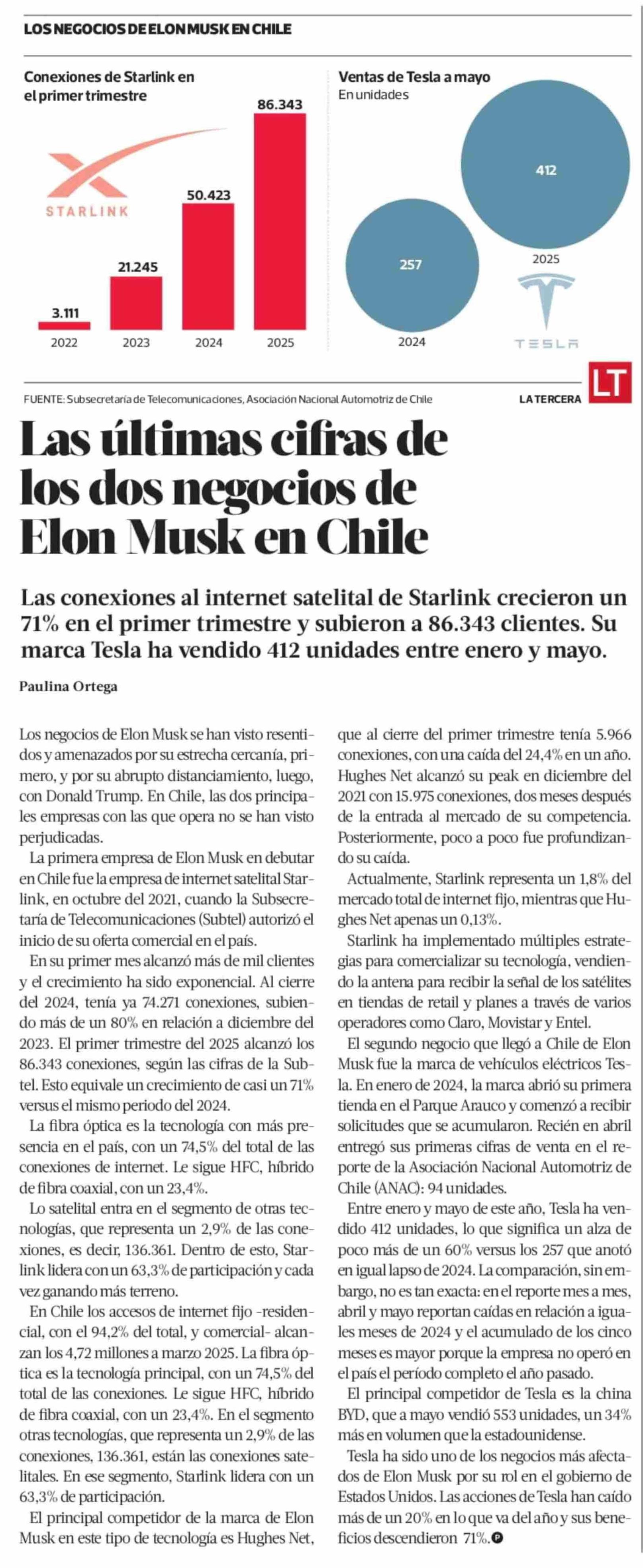 Las últimas cifras de los dos negocios de Elon Musk en Chile 15-06-2025 La Tercera |