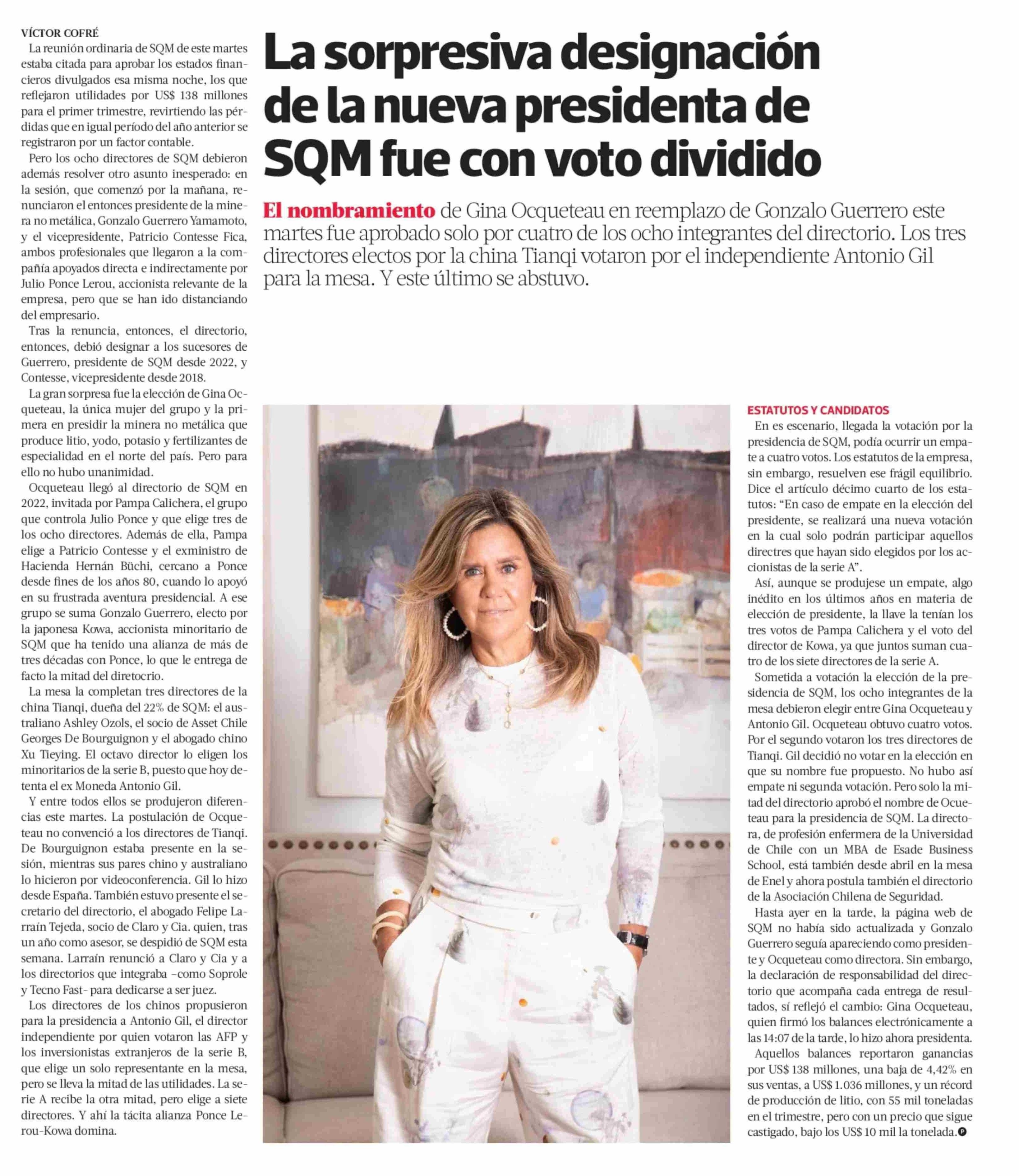 La sorpresiva designación de la nueva presidenta de SOM fue con voto dividido 29-05-2025 La Tercera |