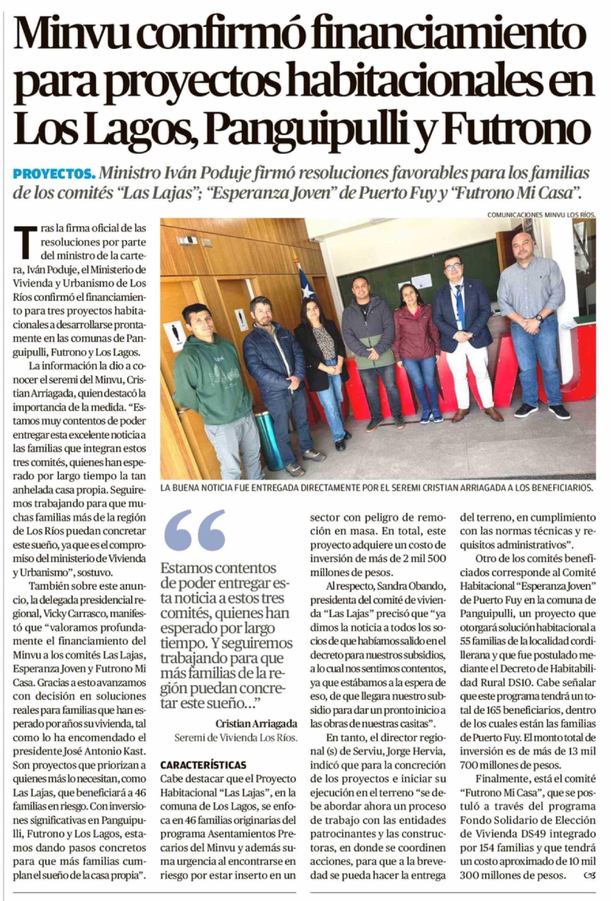 Minvu confirmó financiamiento para proyectos habitacionales en Los Lagos, Panguipulli y Futrono 12-04-2026 Diario Austral Región de Los Ríos |