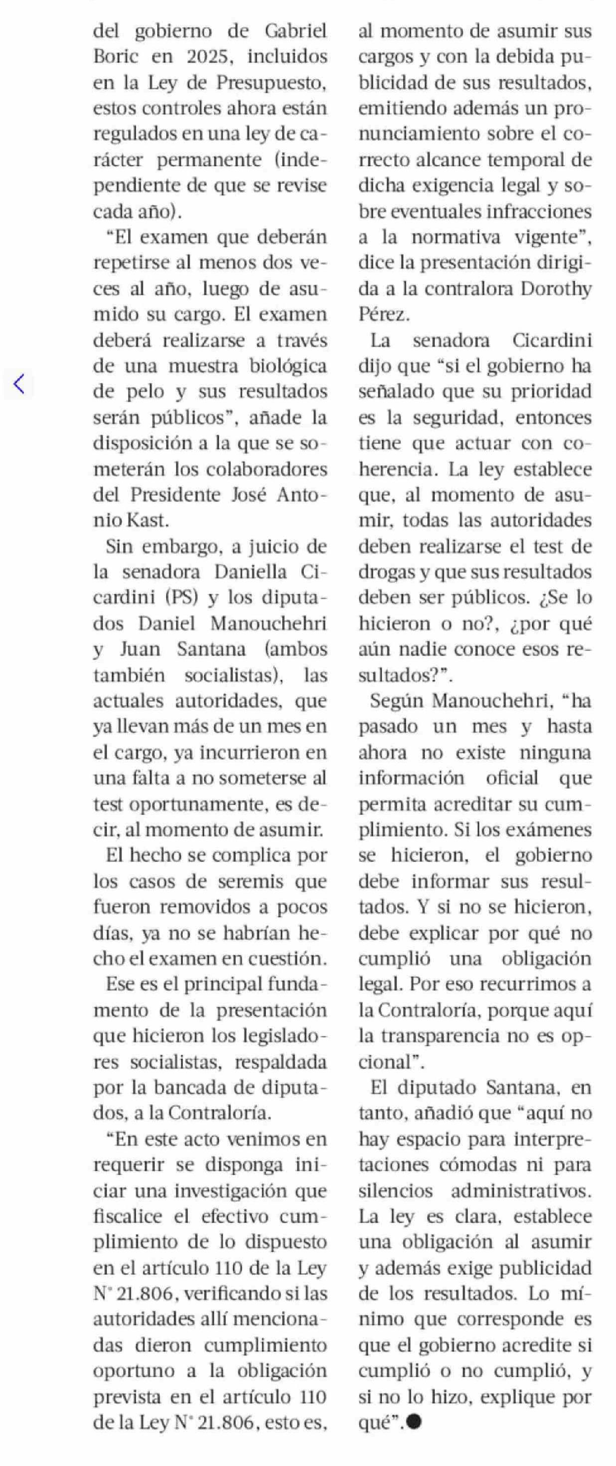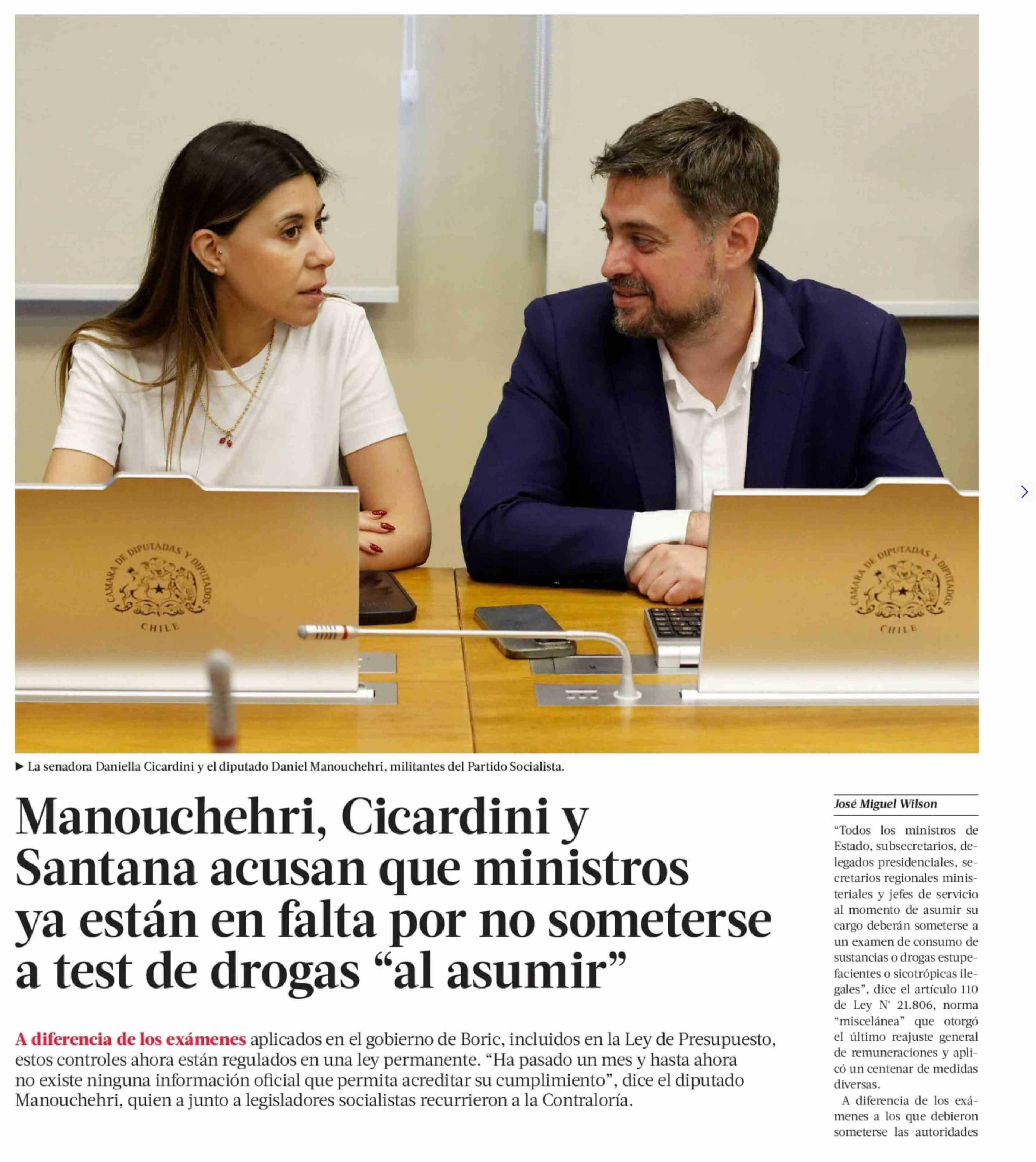 Manouchehri, Cicardini y Santana acusan que ministros ya están en falta por no someterse a test de drogas "al asumir" 08-04-2026 La Tercera |