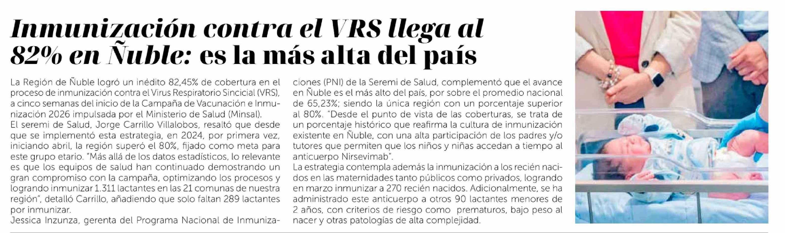 | Título: | Inmunización contra el VRS llega al 82% en Ñuble: es la más alta del país |