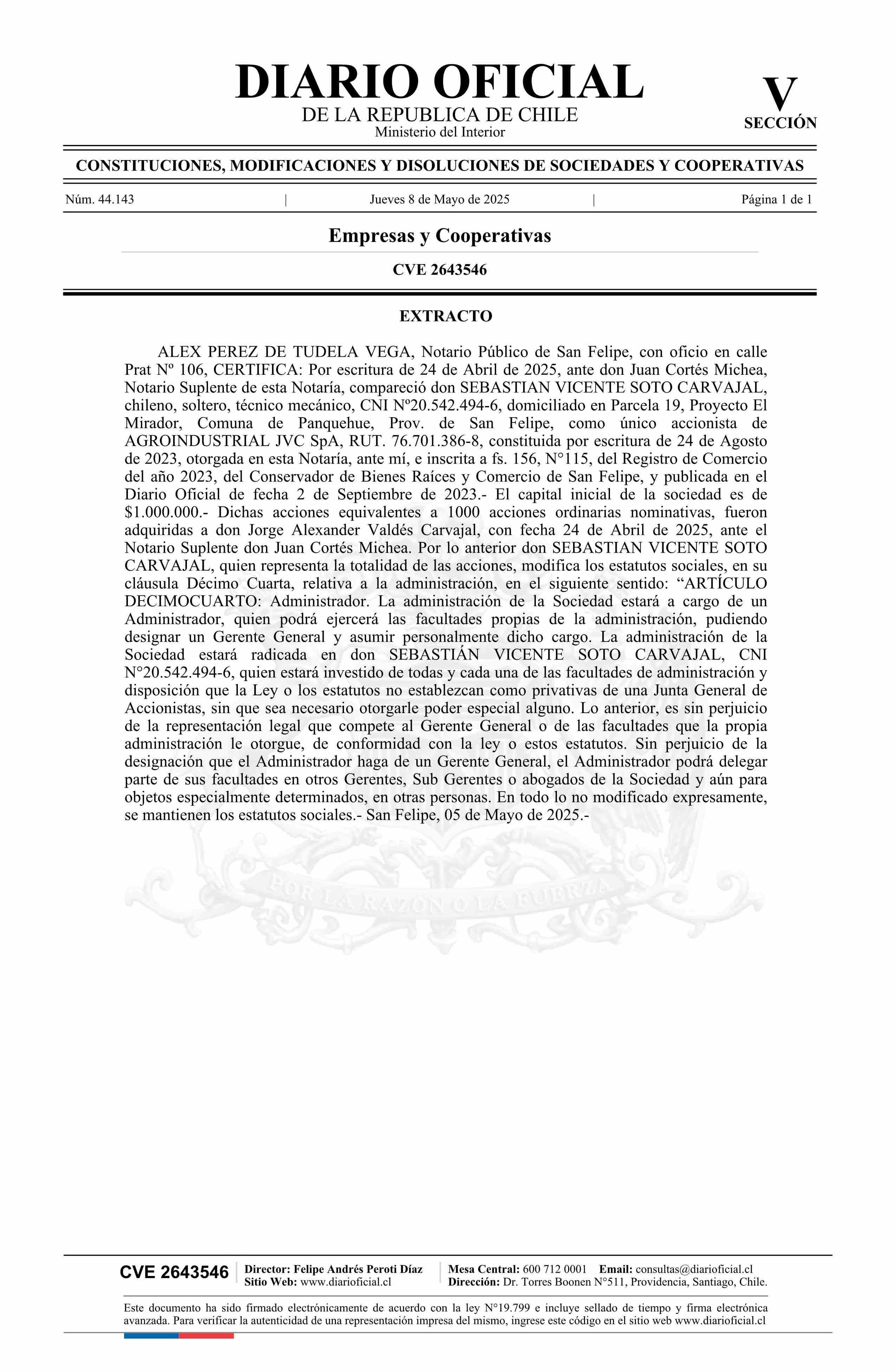 AGROINDUSTRIAL JVC SpA 76.701.386-8* 08-05-2025 Diario Oficial Edición Electrónica |
