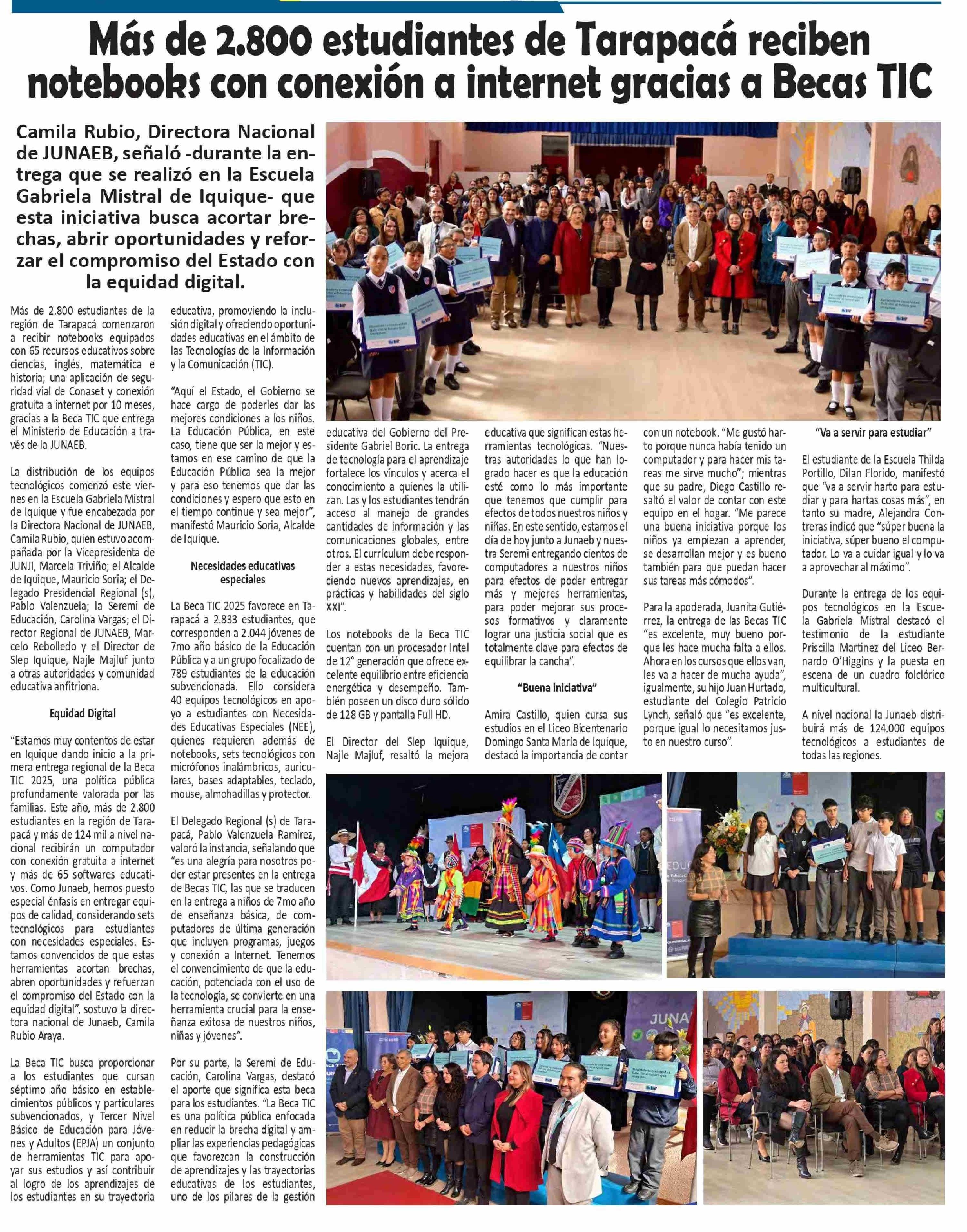 Más de 2.800 estudiantes de Tarapacá reciben notebooks con conexión a internet gracias a Becas TIC 01-06-2025 El Longino |