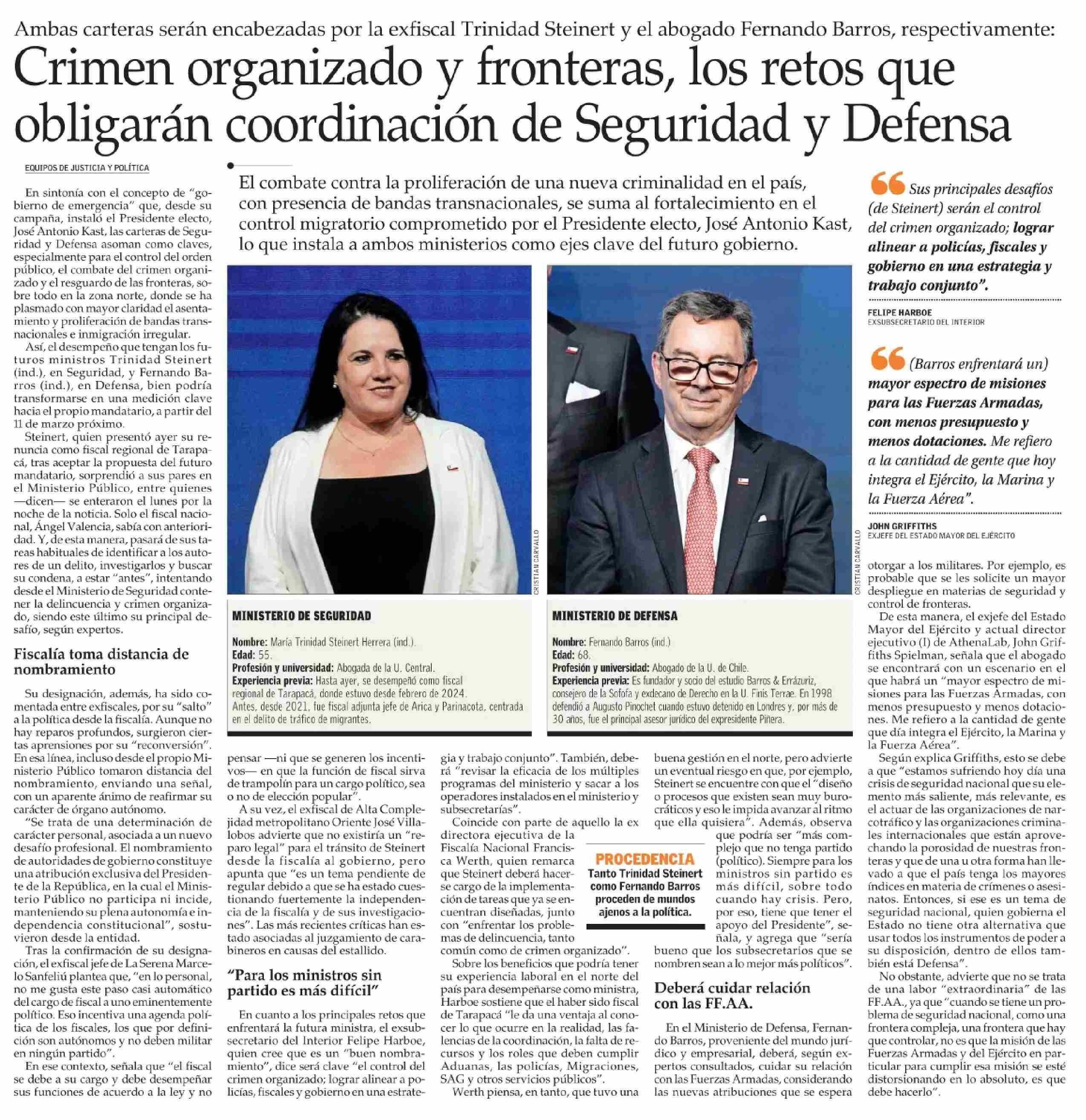 Crimen organizado y fronteras, los retos que obligarán coordinación de Seguridad y Defensa 21-01-2026 El Mercurio |