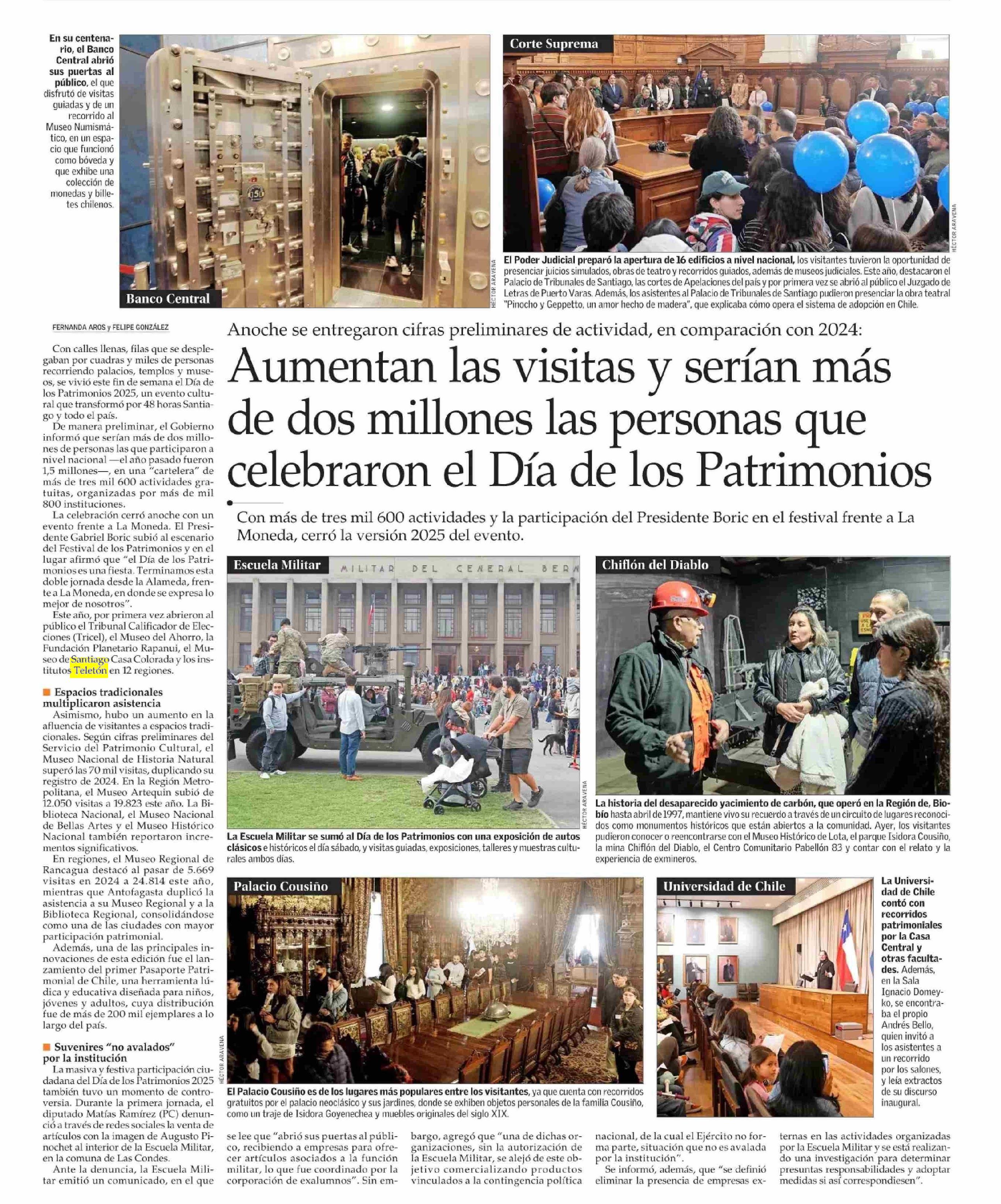 Aumentan las visitas y serían más de dos millones las personas que celebraron el Día de los Patrimonios 26-05-2025 El Mercurio |