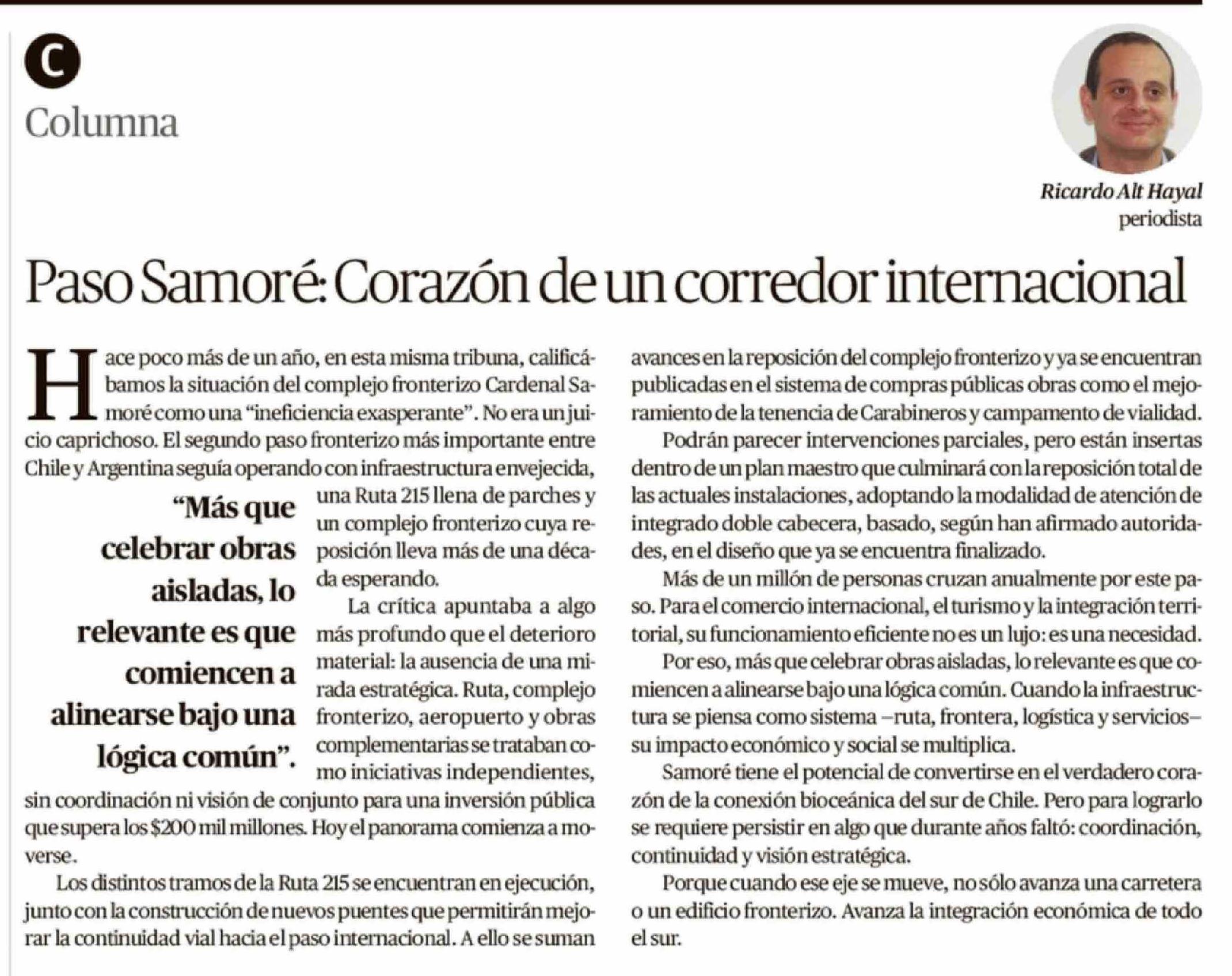 Columnas de Opinión: Paso Samoré: Corazón de un corredor internacional 18-03-2026 El Austral de Osorno |