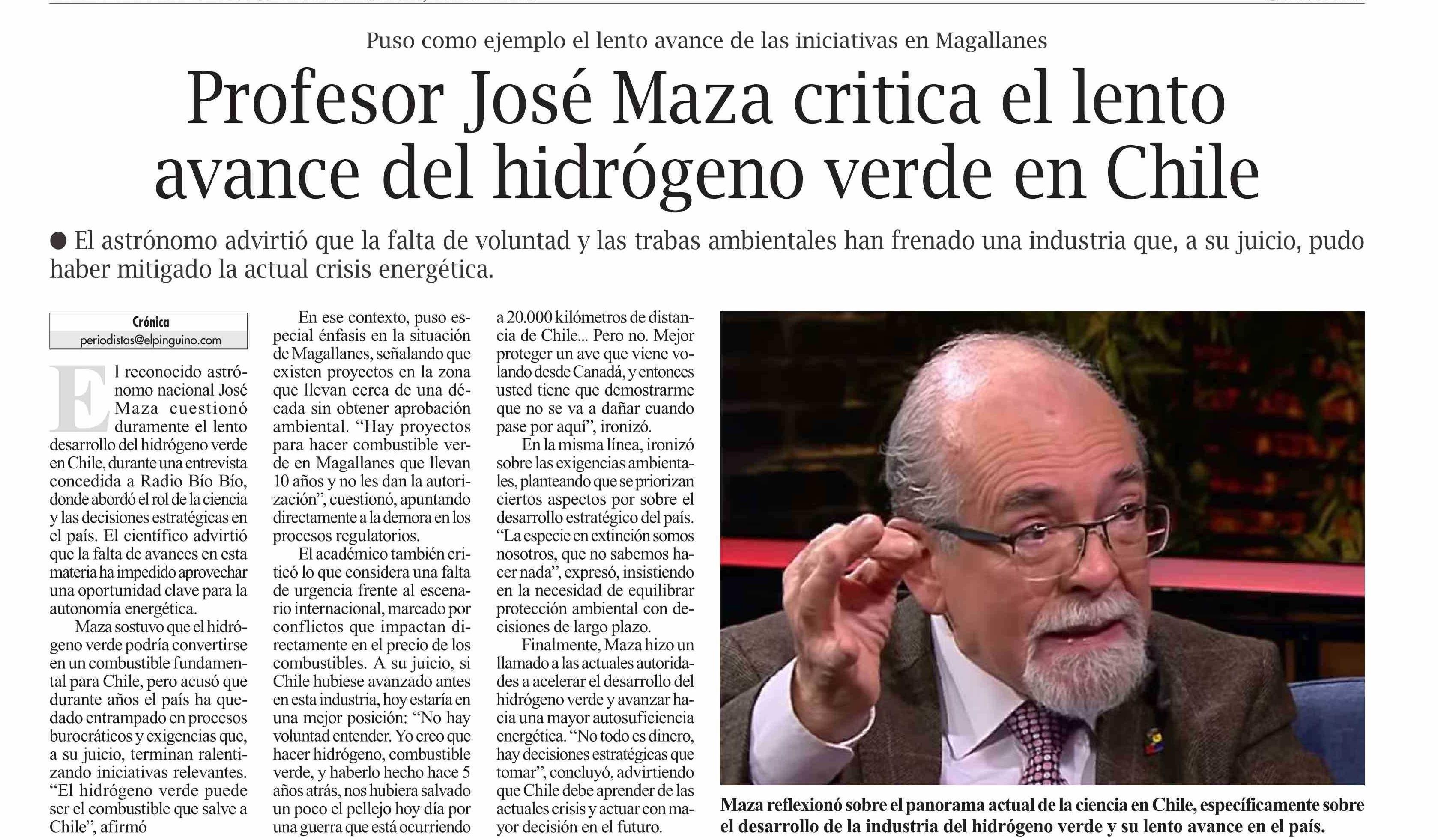 Profesor José Maza crítica el lento avance del hidrógeno verde en Chile 11-04-2026 El Pingüino |