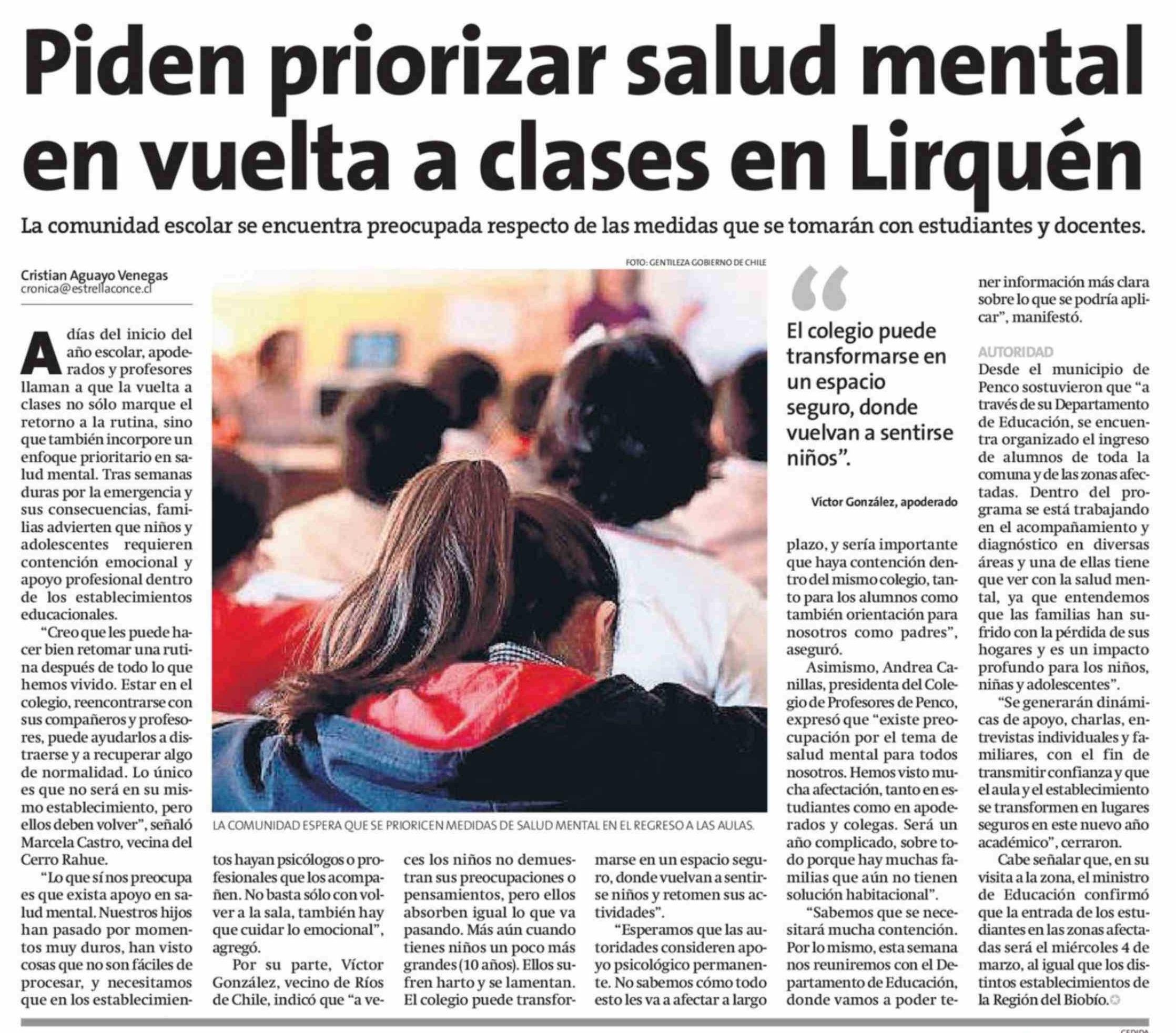 Título: Piden priorizar salud mental en vuelta a clases en Lirquén