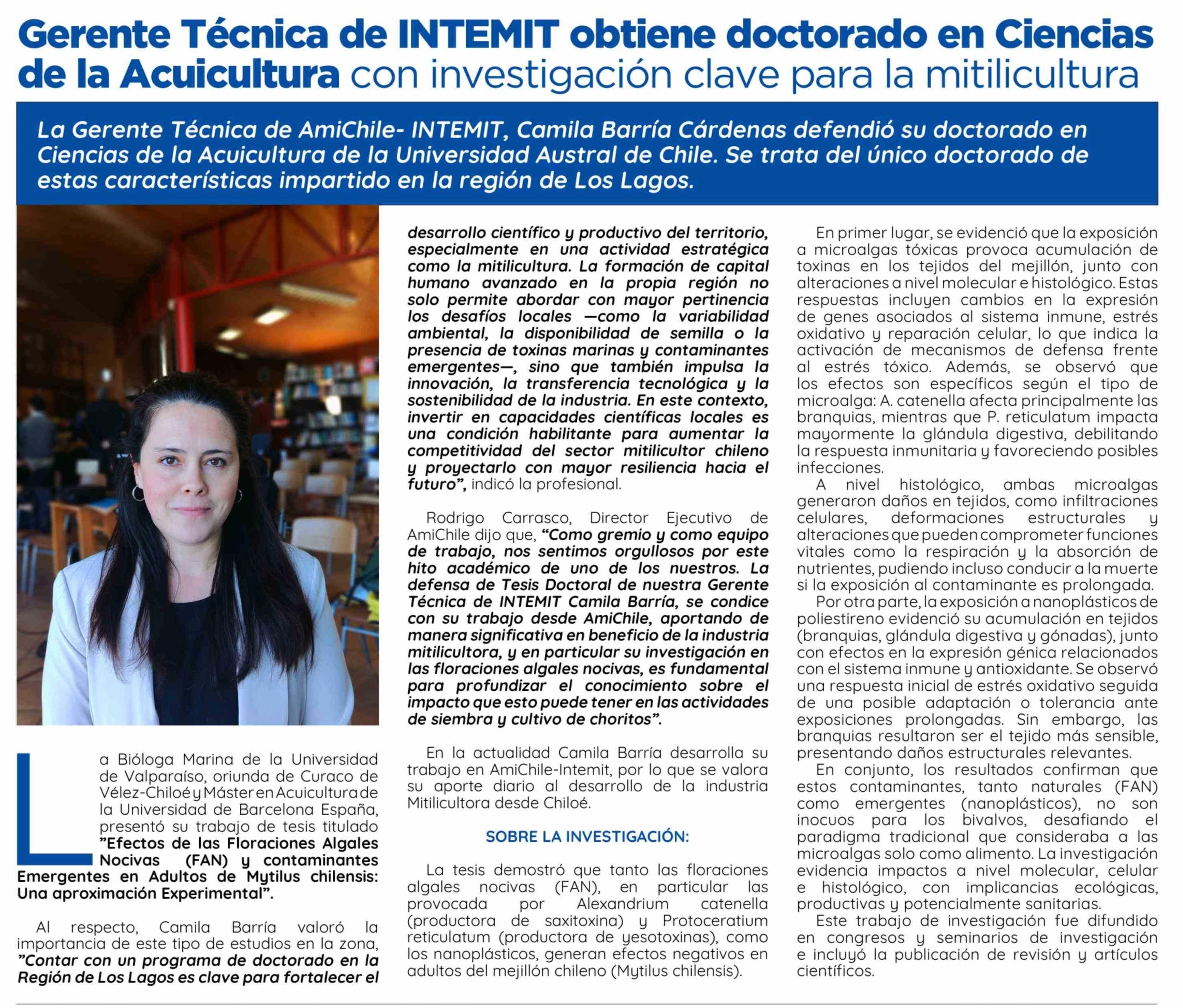 | Título: | Gerente Técnica de INTEMIT obtiene doctorado en Ciencias de la Acuicultura con investigación clave para la mitilicultura |