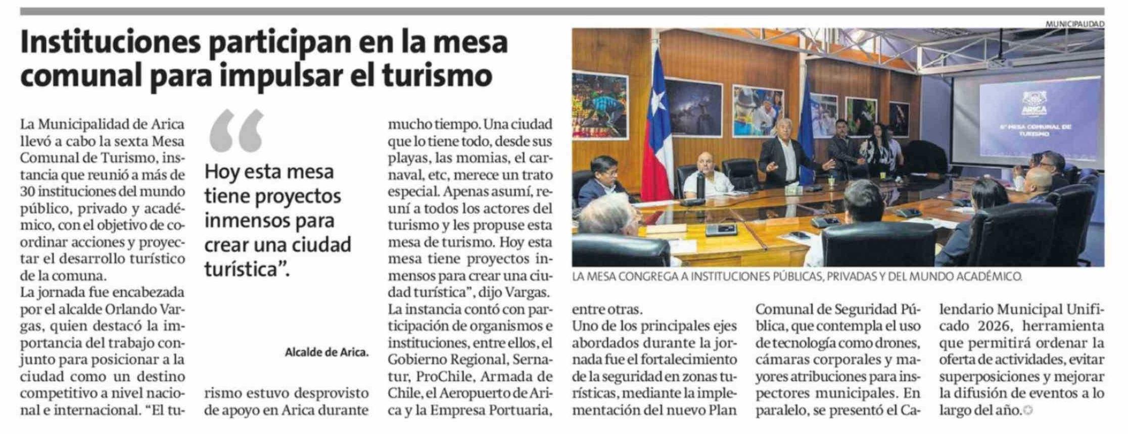 Instituciones participan en la mesa comunal para impulsar el turismo 01-04-2026 La Estrella de Arica |