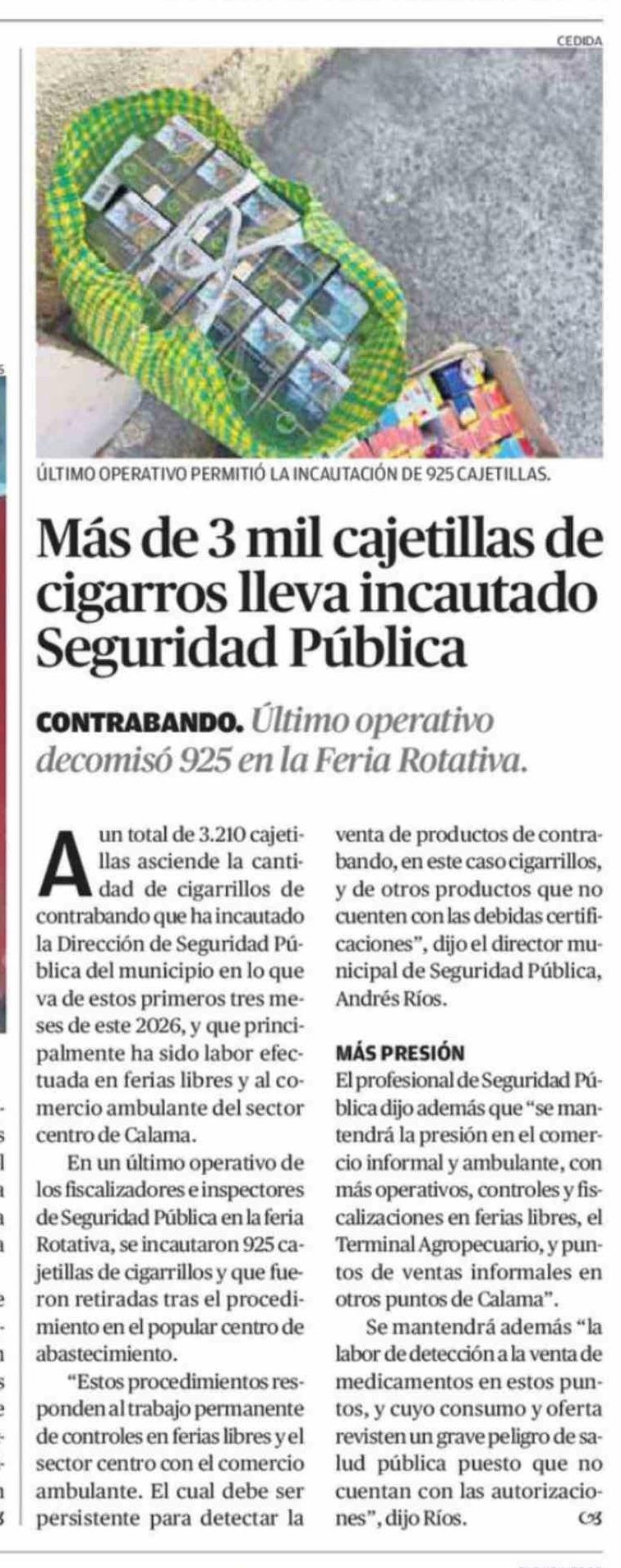 Más de 3 mil cajetillas de cigarros lleva incautado Seguridad Pública 26-03-2026 El Mercurio de Calama |