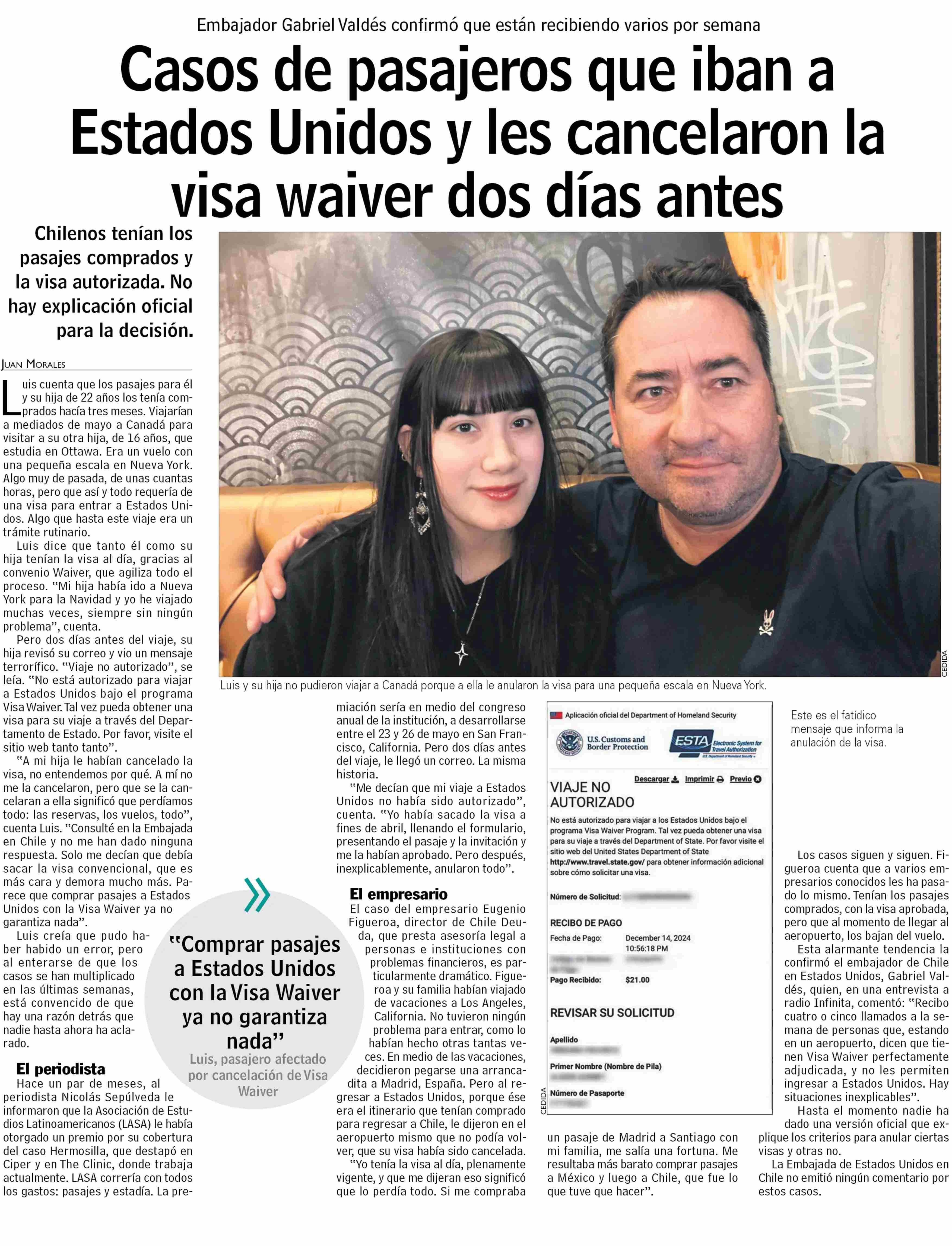 Casos de pasajeros que iban a Estados Unidos y les cancelaron la visa walver dos días antes 28-05-2025 Las Últimas Noticias |