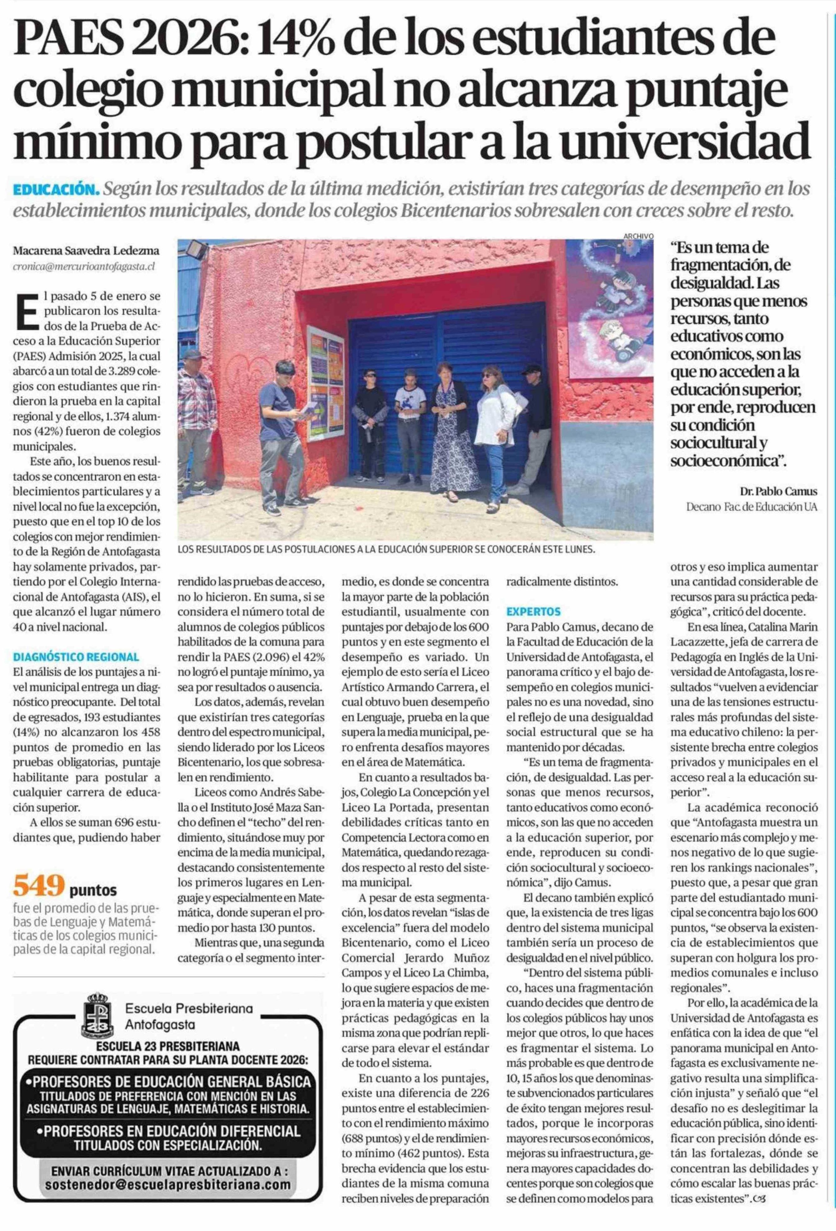 PAES 2026: 14% de los estudiantes de colegio municipal no alcanza puntaje mínimo para postular a la universidad 18-01-2026 El Mercurio de Antofagasta |