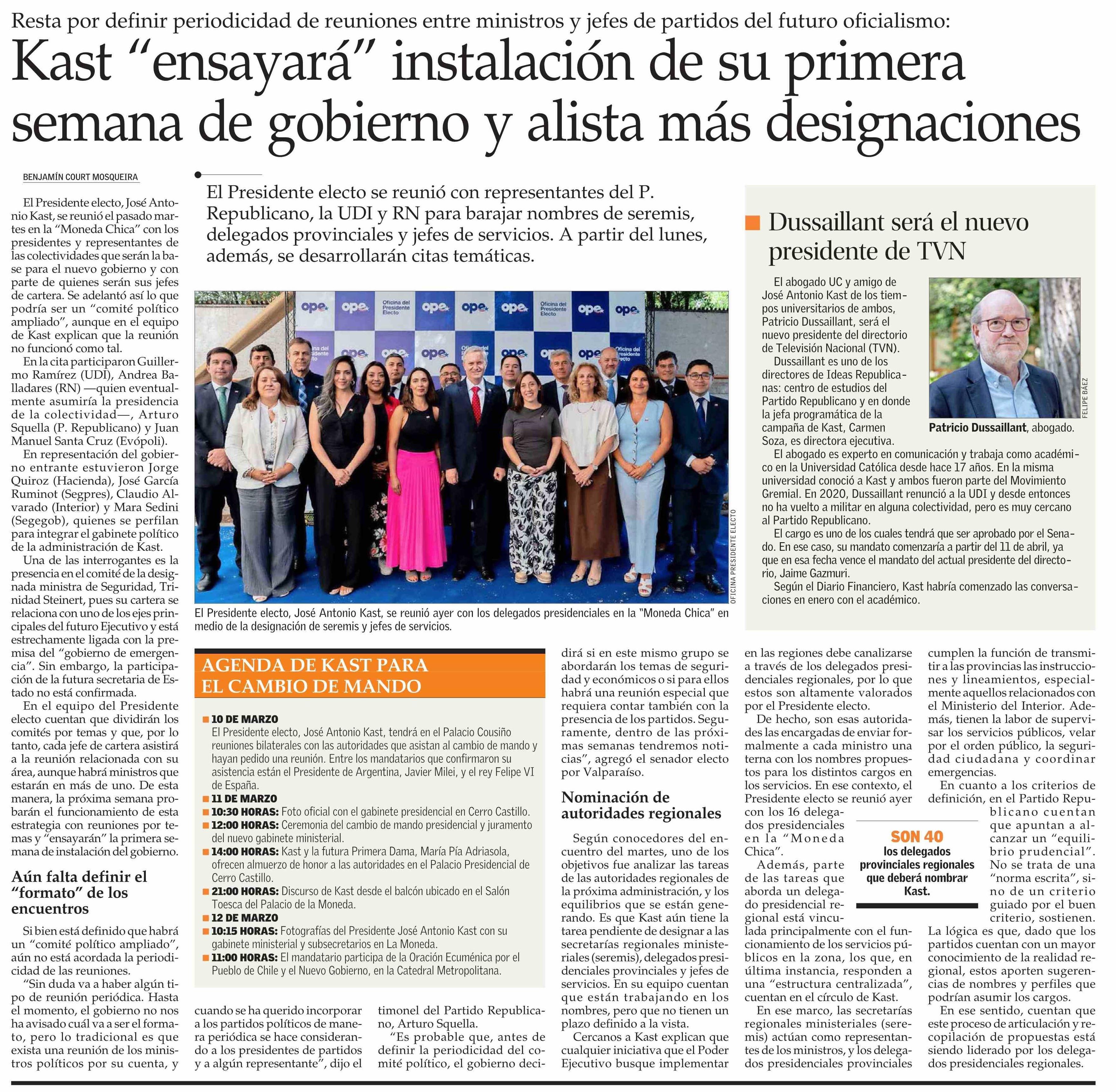 Kast “ensayará” instalación de su primera semana de gobierno y alista más designaciones 28-02-2026 El Mercurio |