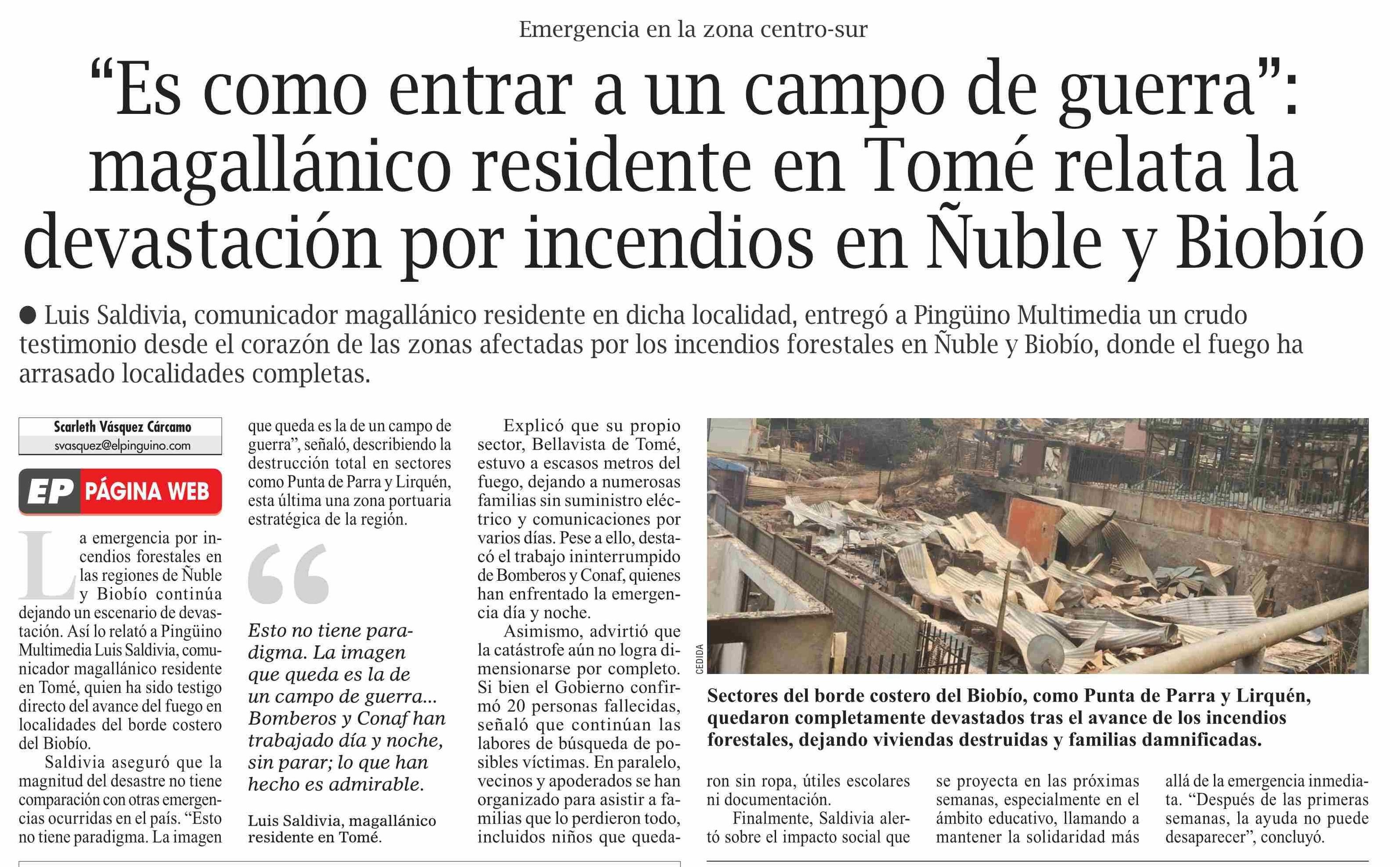 "Es como entrar a un campo de guerra": magallánico residente en Tomé relata la devastación por incendios en Nuble y Biobío 21-01-2026 El Pingüino |